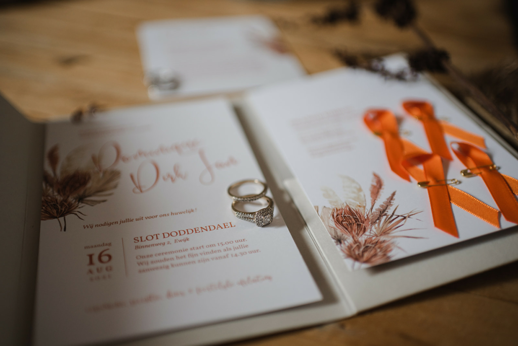 Dit stel besloot na een hobbelige periode te trouwen. Dat deden ze op een prachtige locatie: Slot Doddendael. De prachtige foto’s laten zien hoeveel liefde er tussen de twee is. Hieronder lees je hun (trouw)verhaal. Ondertussen krijg je een kijkje in hun mooie dag. Hint: met veel oranjetinten.