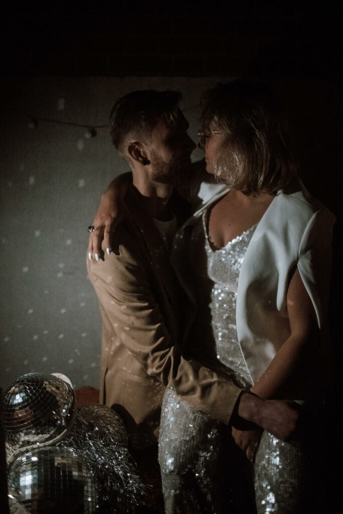 Francine Boer werd gevraagd als fotograaf voor dit heerlijke idee. Francine: “In mijn hoofd had ik bij haar al een glitter vibe idee en stelde dit voor, Roos werd ontzettend enthousiast en bestelde allemaal glitter kleding en witte jurkjes, top! We hielden de shoot bij de NSDM werf en op het dakterras van een vriend van mij. We smashden er 3 flessen champagne en een zak chocoladepepernoten doorheen en daarbij hadden we een klein dakterras feestje met z’n drieën waarbij de maan scheen en we een goed muziekje aan hadden.”