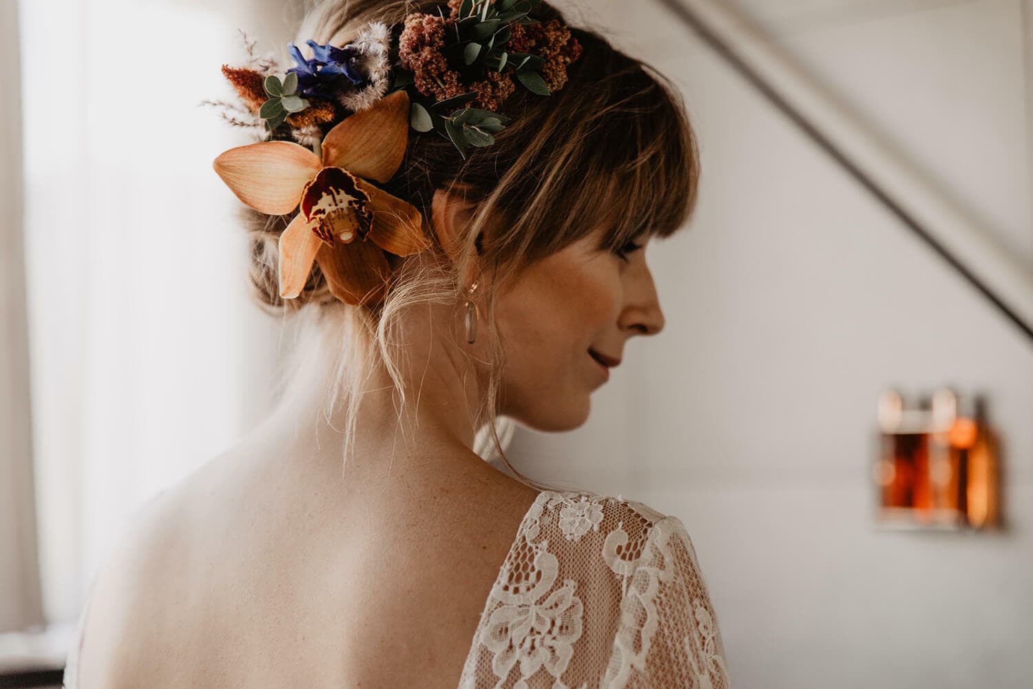 Een ander tof ding aan deze shoot is de bruid in een rolstoel. Omdat het in een rolstoel niet heel praktisch is om een bruidsboeket vast te houden heeft het team van deze shoot in plaats daarvan een tof bloemstuk in het haar van de bruid verwerkt plus een armband. Ik vind het geniaal!