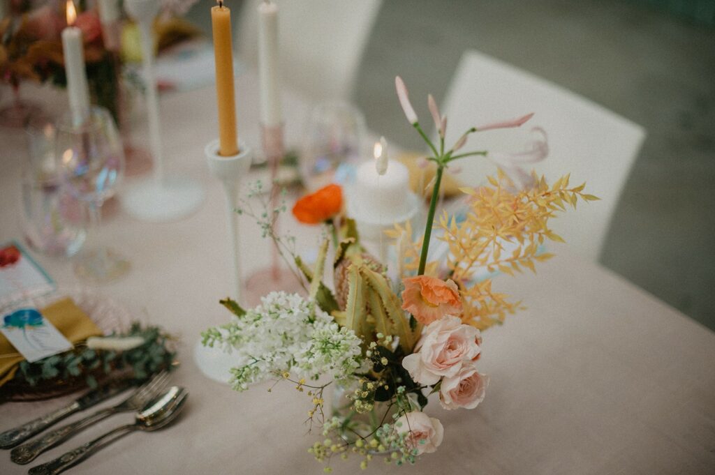 Met zachte, warme kleuren kun je gemakkelijk een speelse en romantische bruiloft creëren. Dit begint natuurlijk al met de trouwkaart, maar vergeet ook niet de bruiloft tafel styling. Het zachtroze kleed dat nonchalant over de tafel hangt is gedekt met service in lieve pastelkleuren en vrolijke bloemen.