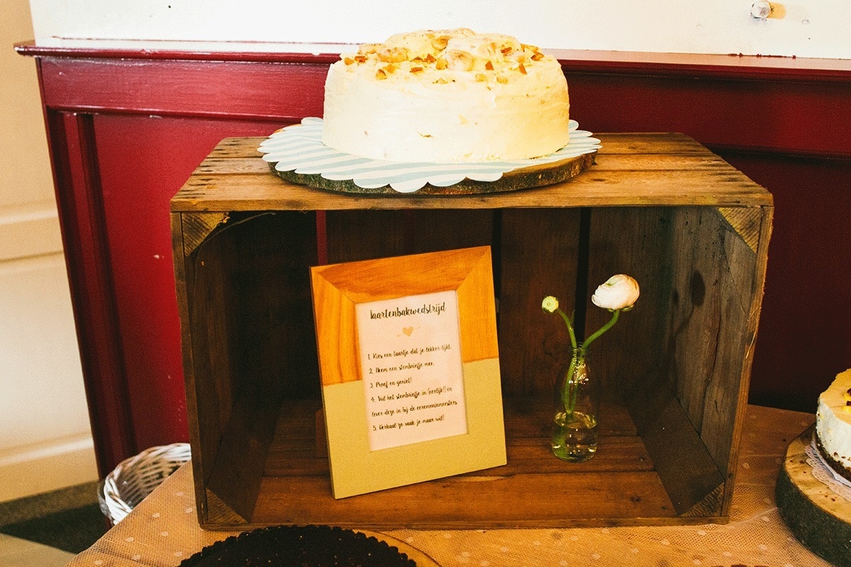Sommige dingen hebben we ook gewoon zo gedaan omdat het ons heel leuk leek. Zo hebben we een taartenbakwedstrijd georganiseerd omdat we stiekem groot fan zijn van Heel Holland Bakt. Gasten die het leuk vonden om te bakken konden zich van tevoren opgeven om mee te doen, en door middel van stembriefjes kon er gestemd worden op de lekkerste taart. Zelfs oma had haar signature-appeltaart gemaakt! Je begrijpt dat er héél veel taart gegeten is, want je kunt pas echt goed vergelijken als je ze allemaal geproefd hebt! De winnaar ging naar huis met een groot pakket vol bakspullen. Dit soort dingen gaven aan de dag ook een extra persoonlijk tintje mee.