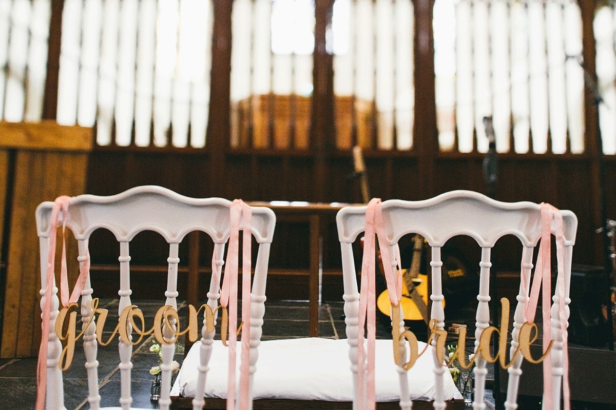 We hebben heel veel zelf gemaakt en verzameld, op een gegeven moment stond ons hele huis vol met decoratie! Thijs heeft mooie lege whiskeyflessen verzameld met z’n vrienden, die op tafel kwamen te staan als vaasjes. Met mijn moeder en zusje heb ik tientallen meters vlaggetjes genaaid, Thijs en ik hebben zelf lichtletters gemaakt en allerlei bordjes getimmerd, boomstamschrijven gezaagd en geschuurd, ik heb een vlaglijn voor boven de taartentafel geknipt, een fotoslinger gemaakt van polaroids, bedankjes voor de gasten en de helpers gemaakt, enzovoorts.