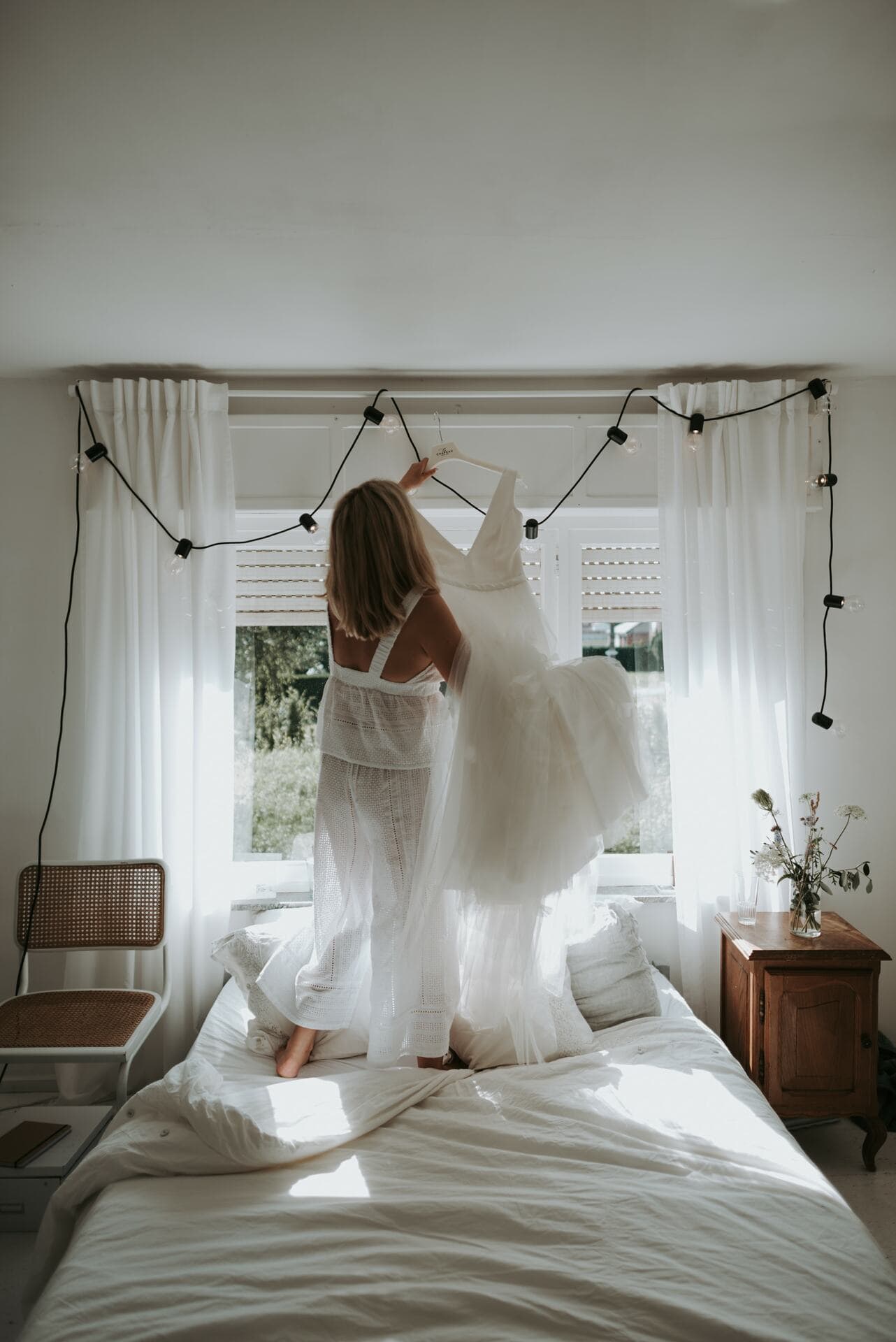 Ik kocht bij Le Chapeau (Antwerpen) een mooie, vloeiende, tullen rok en liet er een bovenstukje aanmaken. Vervolgens heb ik er zelf bloemen op genaaid, dat was wel even knippen en naaien. Het was maar een heel subtiel detail, maar het maakte de jurk wel écht van mij.
