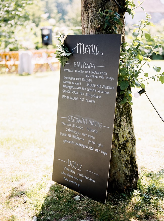 Onze dag was echt super bijzonder. Je hoort wel eens van “de mooiste dag van m’n leven”, maar dat leek ons altijd een beetje overdreven. Toch hebben we het wel zo ervaren. Echt alles klopte: We vierden de huwelijksvoltrekking met onze meest naaste familie en vrienden. Iedereen had zich mooi gemaakt en gekleed en was heel blij voor ons. De boomgaard is al prachtig, maar was nu zó mooi versierd. En we hadden echt zulk mooi weer. Met woorden is lastig te omschrijven hoe speciaal we ons voelden. Na het ja-woord aten we de meest lekkere zoetigheden van onze sweettable en hadden we ook tijd heerlijk met iedereen te kletsen en te genieten. We zijn gek op Italië en zeker op Italiaans eten. Bij het diner genoten we daarom met alle daggasten aan één lange prachtig versierde tafel met onze favoriete gerechten. Het kon echt niet op. Na het diner kwamen er nog meer van onze dierbaren en vierden we feest in de strechtent in de boomgaard. De muziek werd verzorgd vanuit een oud DJ busje en we hadden een kraampje met heerlijke Indische sateetjes, wat het festivalsfeertje compleet maakte. Als we aan de dag terug denken krijgen we steeds weer een grote glimlach op ons gezicht. Het was echt geweldig ♥