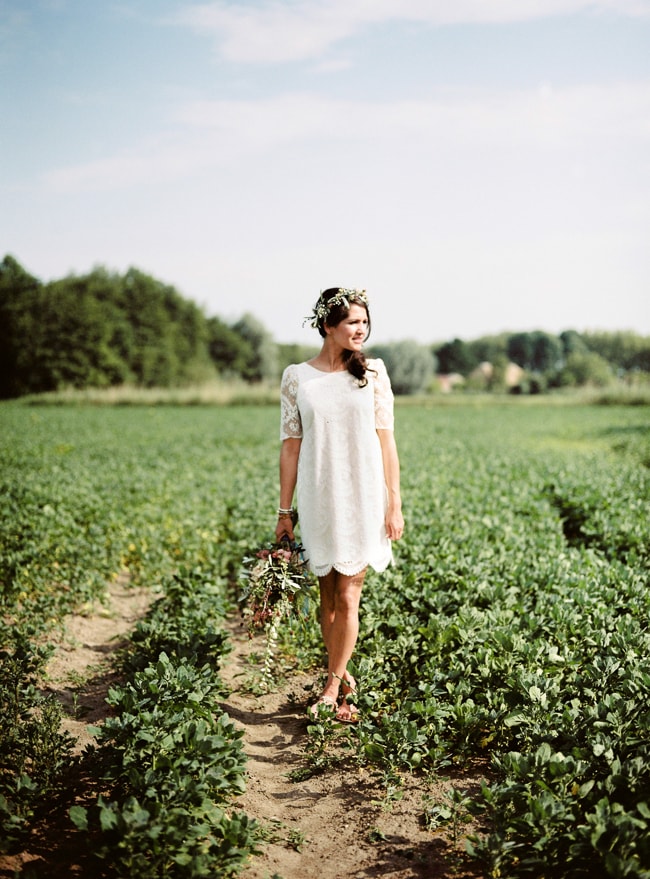 Het vinden van een trouwjurk ging heel moeilijk. Ik ben geen type dat vaak een jurk draagt. Wat me wel mooi leek was een bohemian jurk met prachtig kant. De meeste bruidszaken zijn echter vrij traditioneel, en hebben dezelfde soort jurken. Prachtige jurken maar niets voor mij. Samen met mijn zusje ging ik steeds op pad, en onze geweldige fotografe, Hanke Arkenbout, gaf me geweldige tips. Na vijf bruidszaken te hebben bezocht en ik zelfs overwogen had om een jurk te laten maken, kreeg ik het toch wel een beetje benauwd. Het was toch allemaal niet echt wat ik wilde.. Totdat ik een te gek merk tegen kwam, Laure de Sagazan, uit Parijs. Wat een prachtige jurken ♥ Ze hadden alleen geen verkooppunt in Nederland. Ze konden wel de jurk versturen, maar dat zou erg krap worden. Corné zei: waarom rijden we er niet heen? Dus dat deden we! We reden samen met onze kindjes naar Parijs. Tussen een bezoekje aan de Eiffeltoren en het eten van crêpes door, paste ik mijn jurk in het atelier. Ik wist meteen dat dit hem was. Een mooie korte a-lijn jurk met prachtig kant, helemaal geschikt voor een buitenbruiloft. Missie geslaagd!