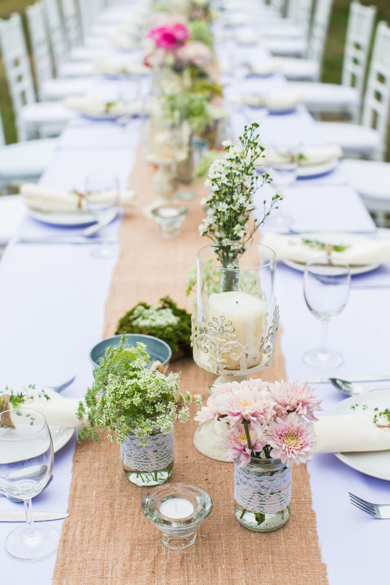 Wat betreft de aankleding is het mooi om voor een bepaald kleurthema te gaan en om daar je aankleding op aan te passen. En een tafelloper doet vaak ook wonderen.
