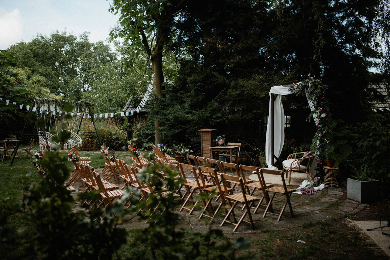 Vlak voor de ceremonie waren we allebei heel gespannen. Ik ben zelfs vergeten mijn bruidsboeket mee te nemen! Maar daar konden we achteraf wel om lachen. Toen ik het pad richting het ‘altaar’ overleefd had zonder over mijn jurk te vallen, toen was de grootste spanning voorbij en kon het genieten beginnen.