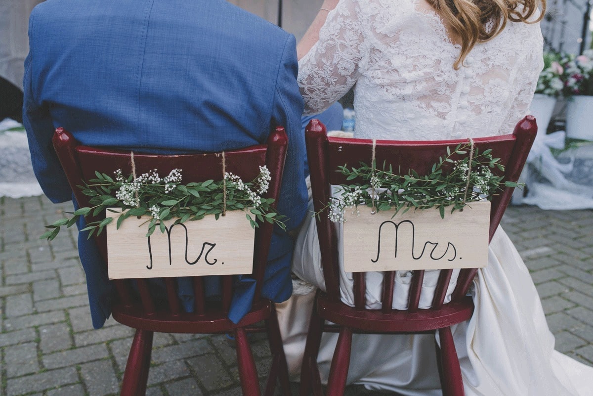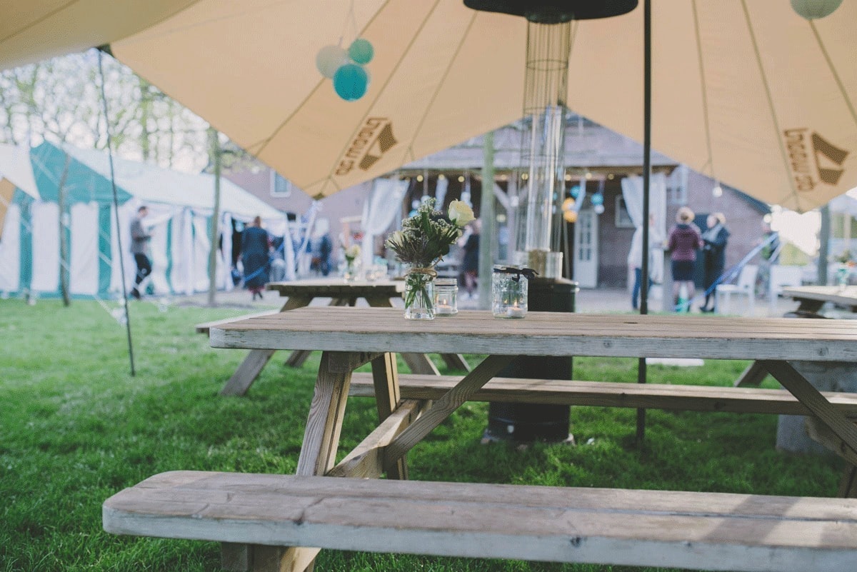 We hebben gekozen voor een festivalbruiloft omdat we de gasten die we uitnodigden ook de hele dag konden laten blijven en met die gasten een geweldig feest konden hebben. Ze konden zelfs blijven slapen als ze dat wilden. Voor de locatie hebben we een boerderij in Ermelo gekozen waar vaker bruiloften gehouden worden. De dag ervoor zijn we met onze lieve familie begonnen met opbouwen en de dag erna hebben zij weer geholpen met de boel afbreken. We hebben een podium laten bouwen op de locatie waar de bandjes stonden en daarvoor hebben we voor de ceremonie stoelen, banken en hooibalen gezet. Na de ceremonie zijn er tafels en banken neer gezet.