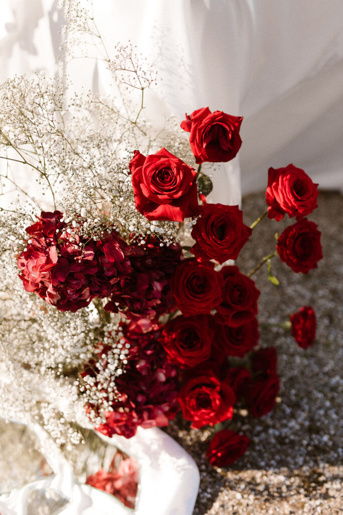 De bloemstyling? Die was natuurlijk helemaal afgestemd op het kleurenpalet. Diepe bordeauxtinten gecombineerd met witte accenten, aangevuld met metalen kandelaars die voor dat beetje extra drama zorgen. Het resultaat is luxe en romantisch, maar – en dat is het mooie – zonder dat het formeel of stijf wordt.