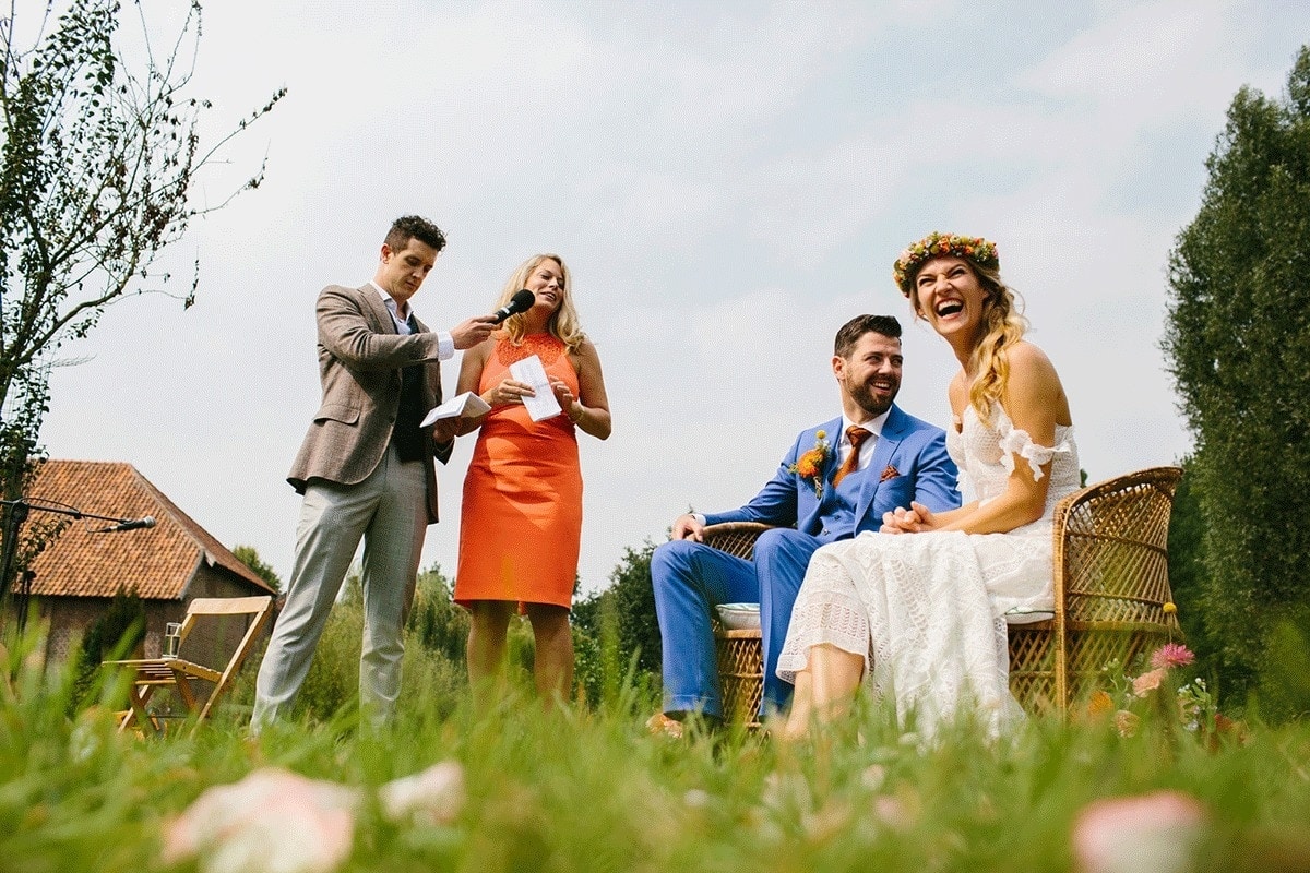Oh jee, ik kan niet kiezen. De ceremonie was natuurlijk prachtig en speciaal, maar eerlijk gezegd heb ik ook heel erg genoten tijdens het diner. Met alle gasten aan een lange tafel, buiten in het gras. Prachtig versierd met bloemen, iedereen die geniet van het eten en wijn en met een prachtige emotionele, maar ook humoristische speech van mijn broertje. Dit moment was heel speciaal en ik denk er nog vaak aan terug.