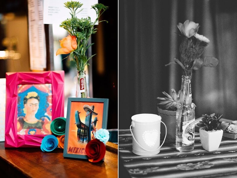 Ik heb veel van de decoratie zelf gemaakt. Door het Mexicaanse thema was dit best gemakkelijk. Alle kleuren mogen door elkaar gebruikt worden. Ik heb zelf een bakkerij voor bruidstaarten, dus ik kom op erg veel bruiloften. Ik wist dus heel goed wat ik niet wilde. Het moest echt een ongedwongen kleurrijk feestje worden. Edwin vond gelukkig alles wel best. Hij was wel meteen enthousiast over het Mexicaanse thema, wij houden erg van skulls en de Mexicaanse skulls mochten dan ook niet op onze uitnodiging ontbreken. Schedels op een bruiloft zijn vaak niet zo feestelijk, maar in een Mexicaans jasje ging het prima samen. Ik heb veel leuke spulletjes bij return to sender gevonden. Een vriendin heeft uit Peru de gekleurde dekens mee gebracht. Van te voren hebben we veel Mexicaanse biertjes gedronken, de flesjes hebben we als vaasjes gebruikt. Ik heb kettinkjes voor om de fleshals gemaakt van leuke kleurrijke kraaltjes en skull hangertjes.