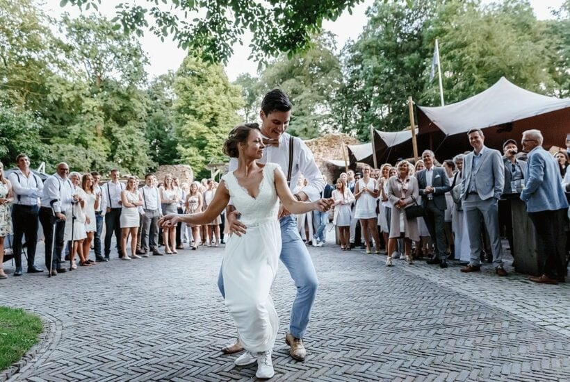 Gasten die wit dragen, en ook een bruid met een witte jurk. Het kon gewoon op deze festivalbruiloft! Bekijk snel de foto’s >>