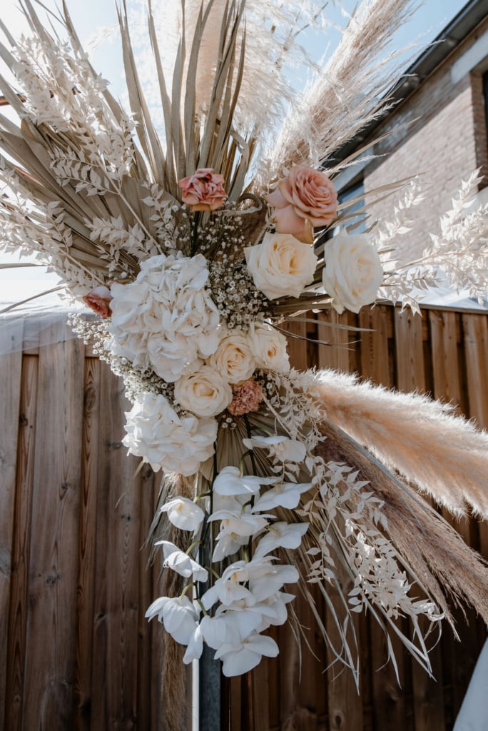 Ik besloot de planning van de bruiloft zelf organiseren, omdat ik tijd over had en een duidelijke visie had over hoe het eruit moest zien. Ik kwam eerst met een kleurenschema dat bestond uit verschillende beige tinten en wit met een vleugje groen. Om duurzamer te zijn, besloot ik decoratie te kiezen die ik kon hergebruiken voor de styling van mijn nieuwe huis. Dit concept werkte goed voor mij! Na de bruiloft was ik blij dat ik een deel van de trouwdecoratie in mijn huis had verwerkt, wat de mooie herinneringen aan onze trouwdag levend houdt. Mijn doel was om een ontwerp te creëren dat er chic en stijlvol uitziet door gebruik te maken van een variatie aan betaalbare en dure artikelen en verschillende materiaalstructuren. Ik zou het omschrijven als natuurlijke elegantie.
