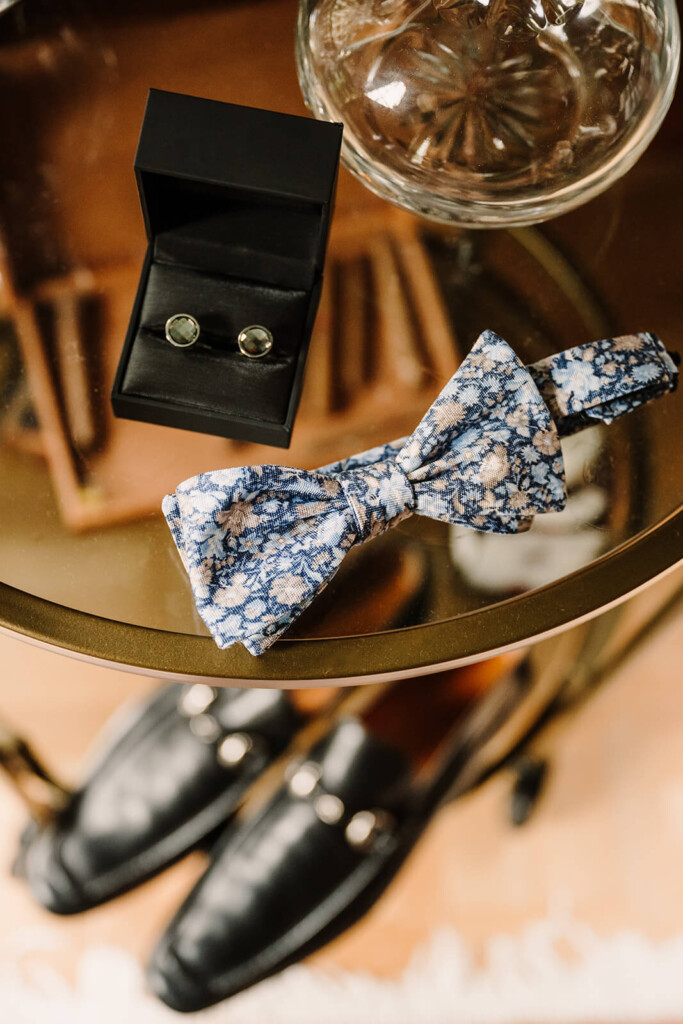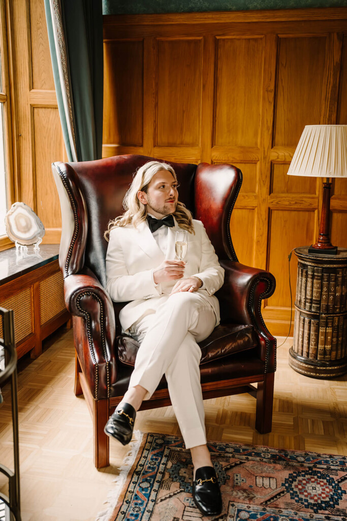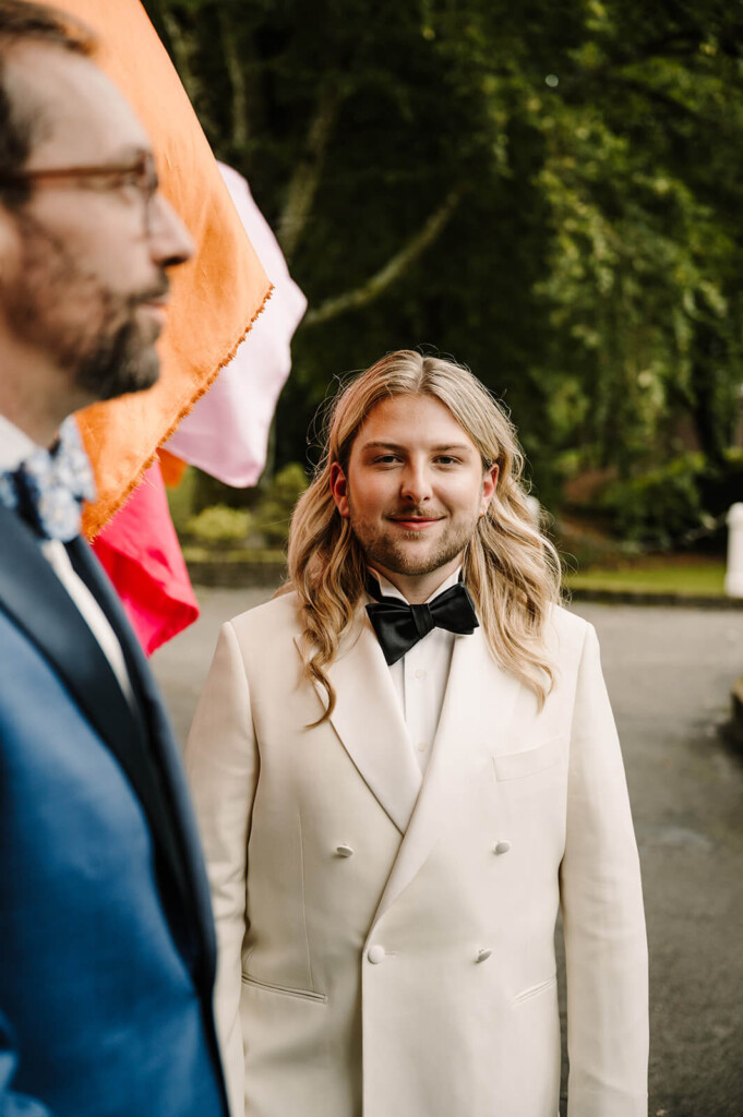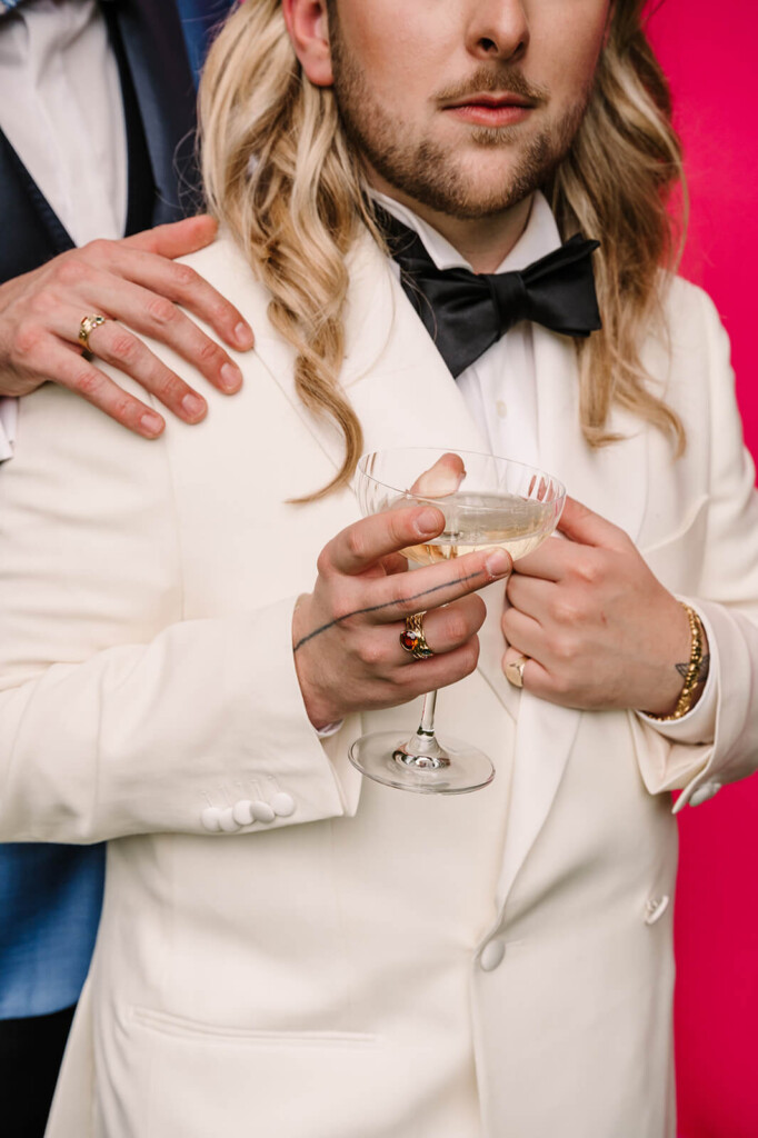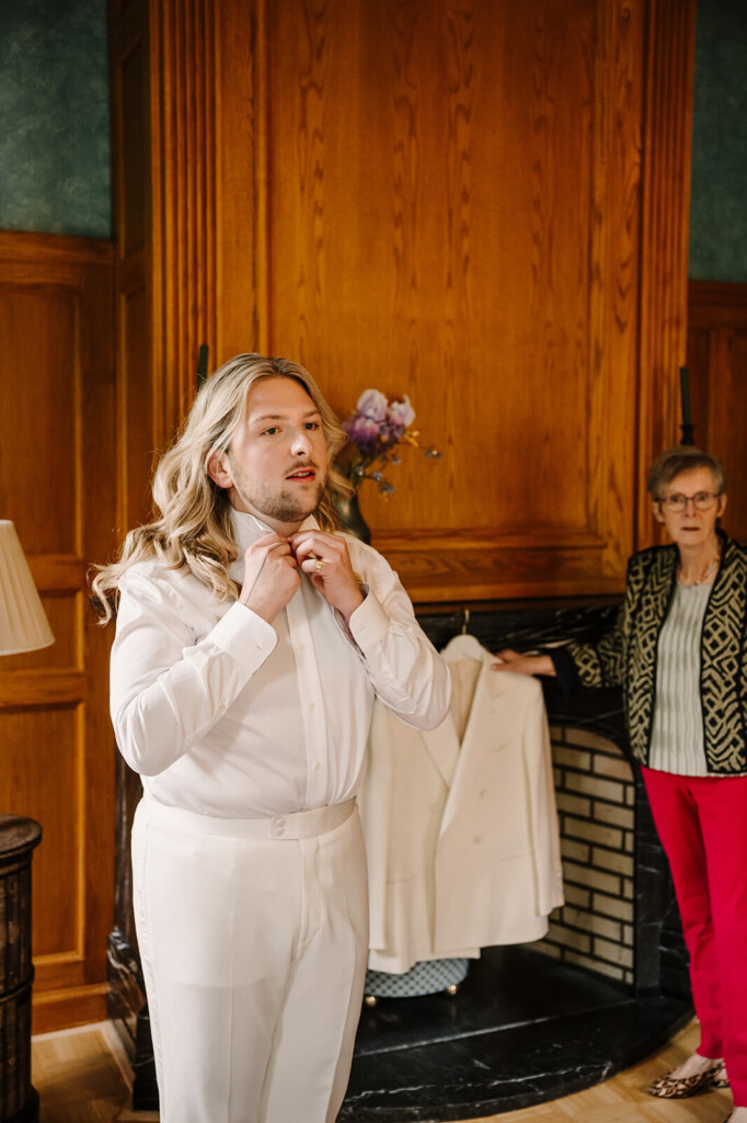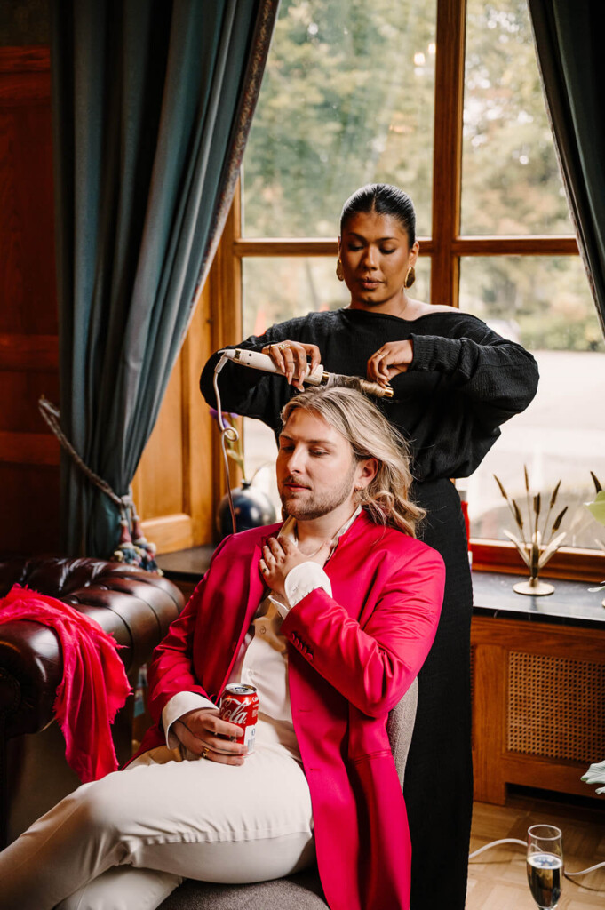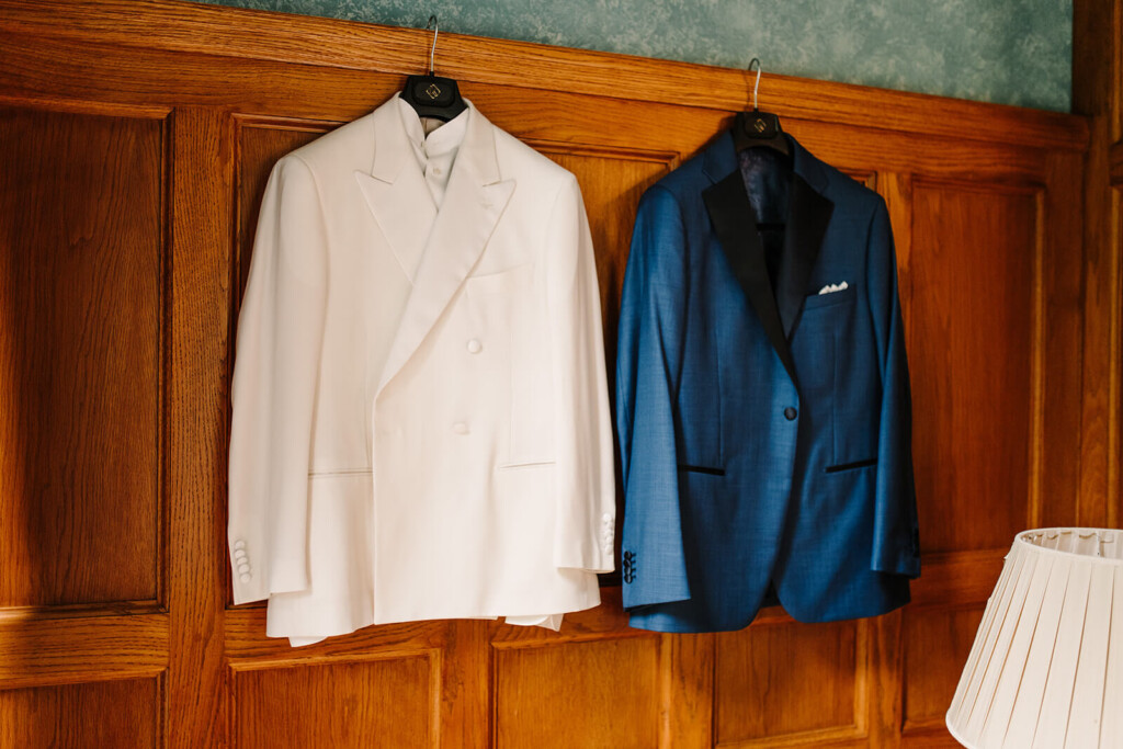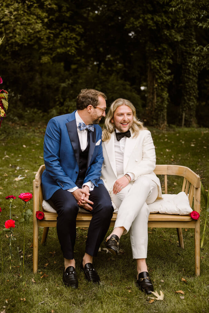 We hebben beide onze maatpakken laten maken bij De Kleermakers in Meppel. Daar zijn we helemaal opgemeten, de pakken zijn in Italië gemaakt. Het waren wollen pakken in smokingstijl. Jochem droeg een crèmekleurige smoking met zwarte Gucci loafers en Wouter droeg een donkerblauwe smoking met ook Gucci loafers. Jochem had voor de avond nog een roze mandarin jacket voor het feest.