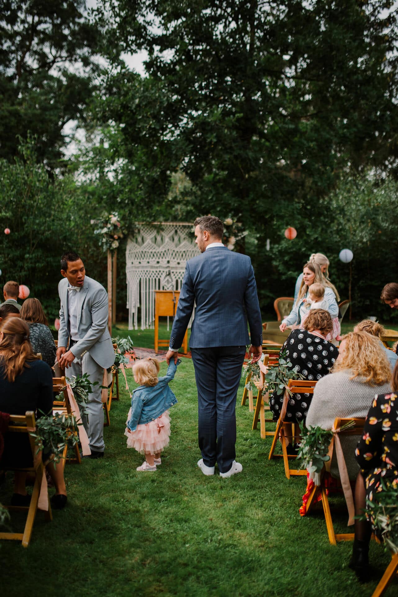 We hebben een aantal dingen bij Wedding Deco gekocht, zoals de lampionnen, de glazen buisjes waarin de confetti zat en de prikkertjes voor het eten. De pompoms en de tipitent zijn van Ali Express en de bloemen zijn verzorgd door Bloemenzo Joyce. En de meubels, kleedjes, kussens en welkomstbord zijn van Happy Vintage.