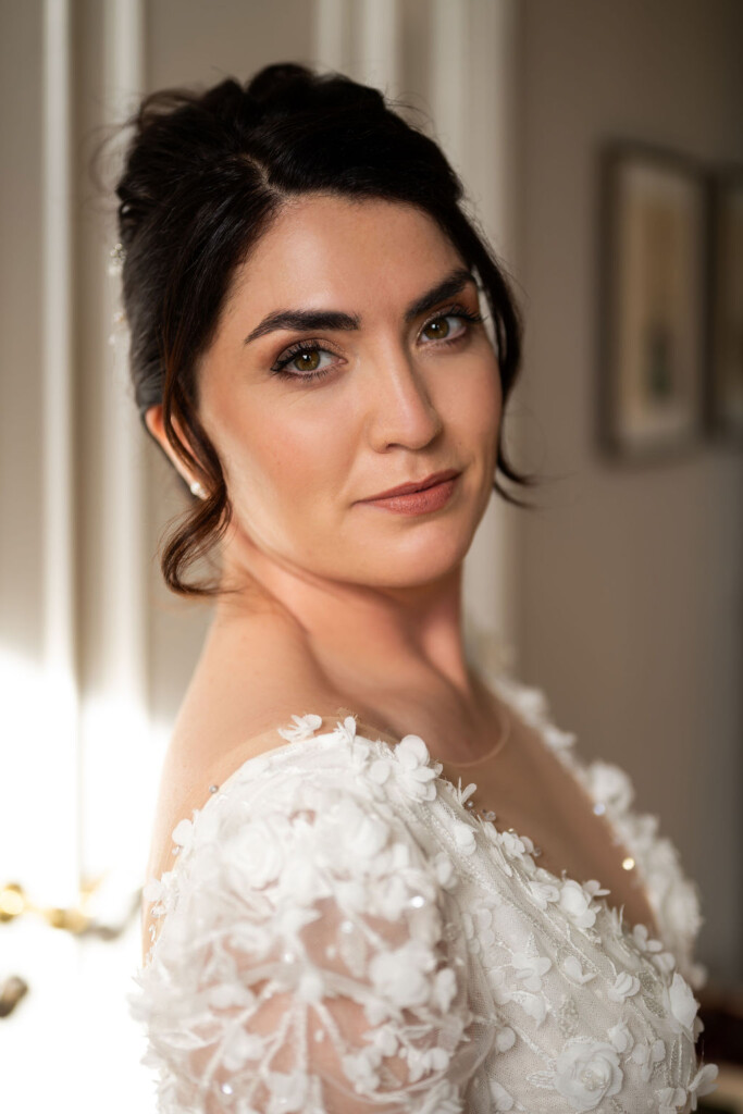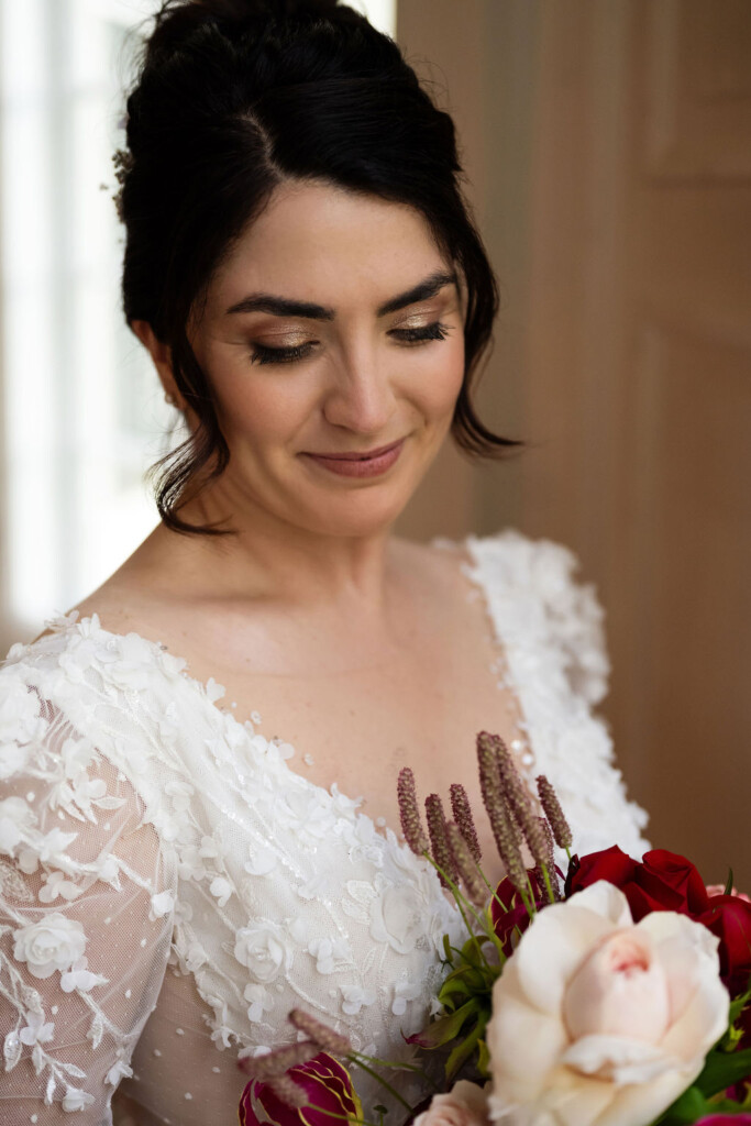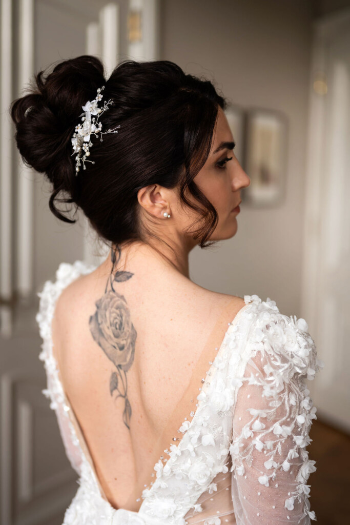 Een prachtige trouwjurk met bloem-applicaties, een chique updo in haar haren… deze bruid ziet er waanzinnig uit! En het lijkt wel alsof haar tatto speciaal gemaakt is voor deze shoot, wat een prachtige match met het bloemwerk.