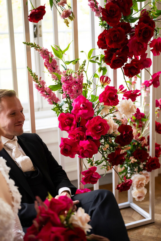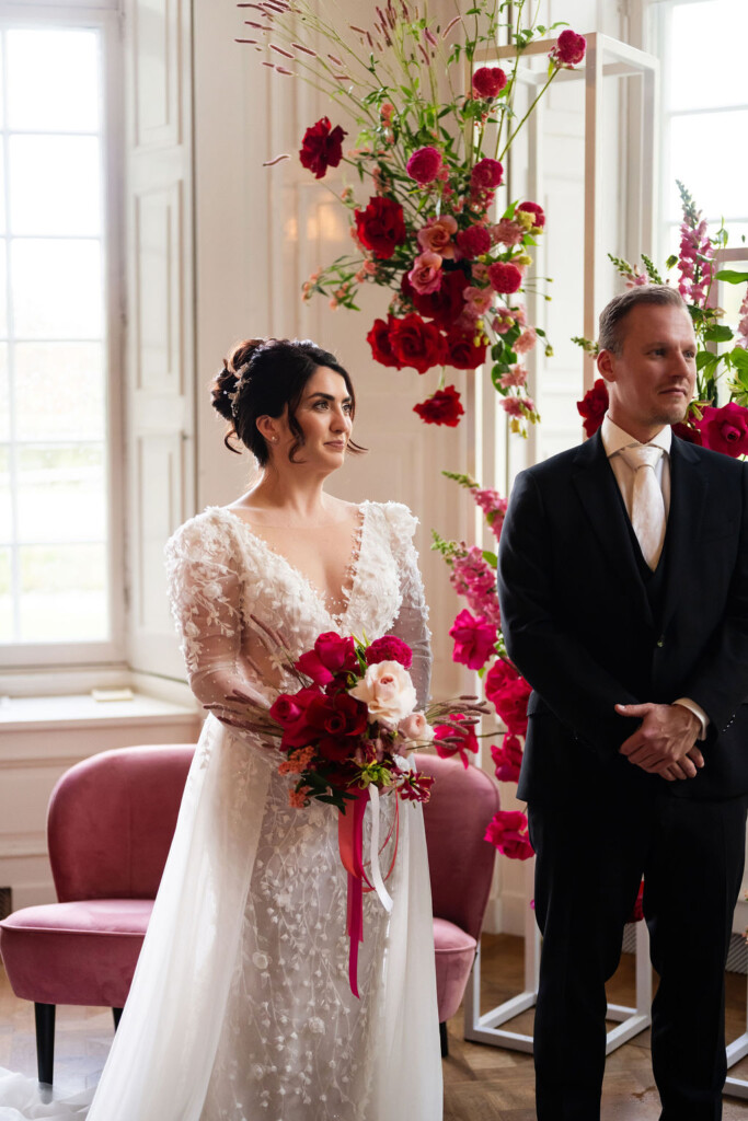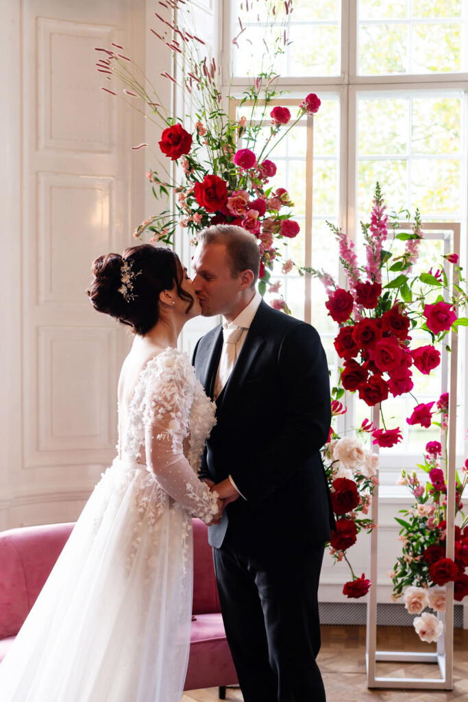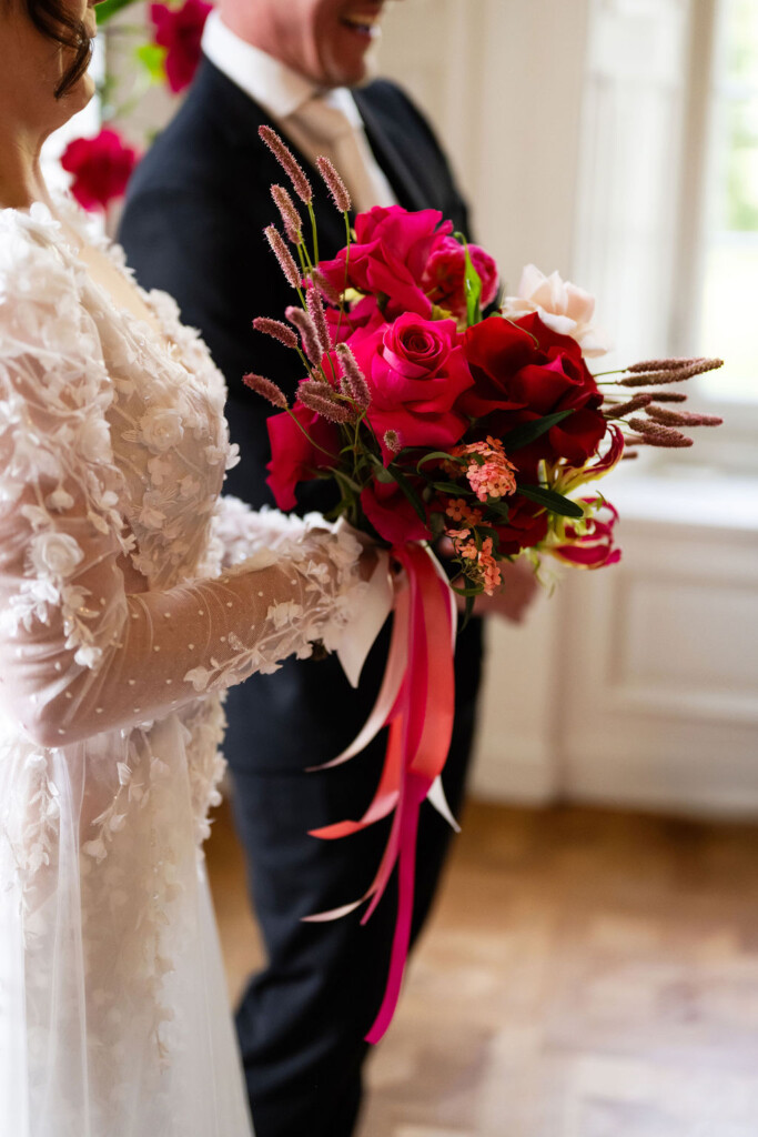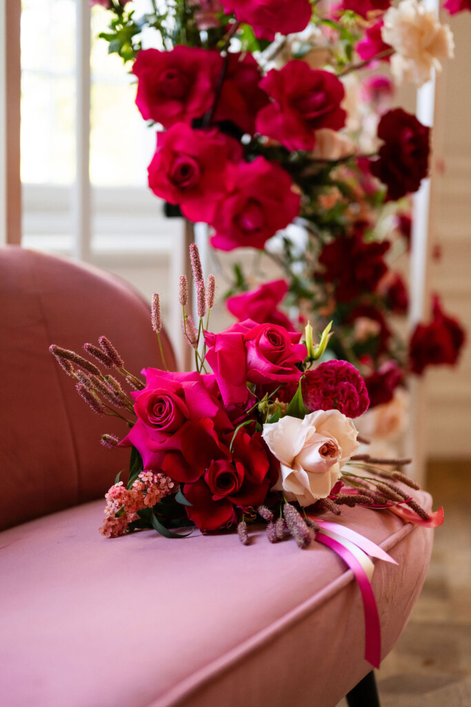 Een bruiloft hoeft niet wit en minimalistisch te zijn om romantisch te voelen. Dat bewijst deze Romantic Red styled shoot op Landgoed Salentein: knallend rood en roze, gecombineerd met weloverwogen bloemendetails, zorgen voor een sfeer die tegelijk uitbundig en intiem is. De absolute eye-catcher? De flowerwaterval op de eettafel.
