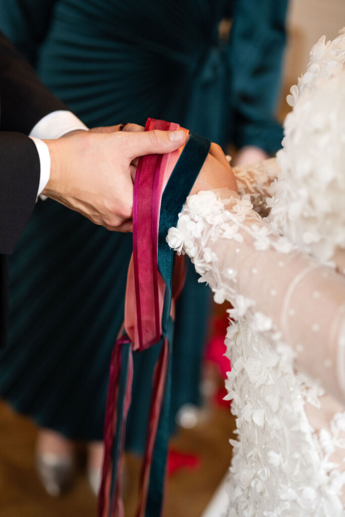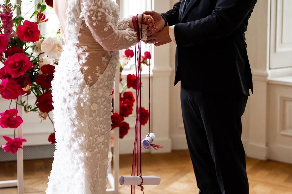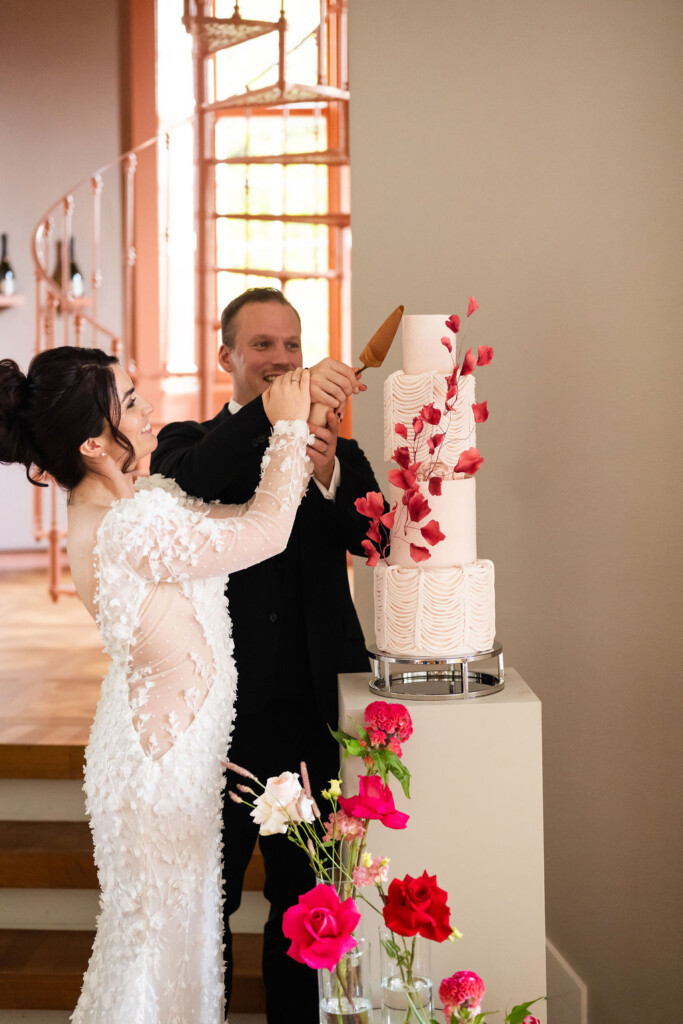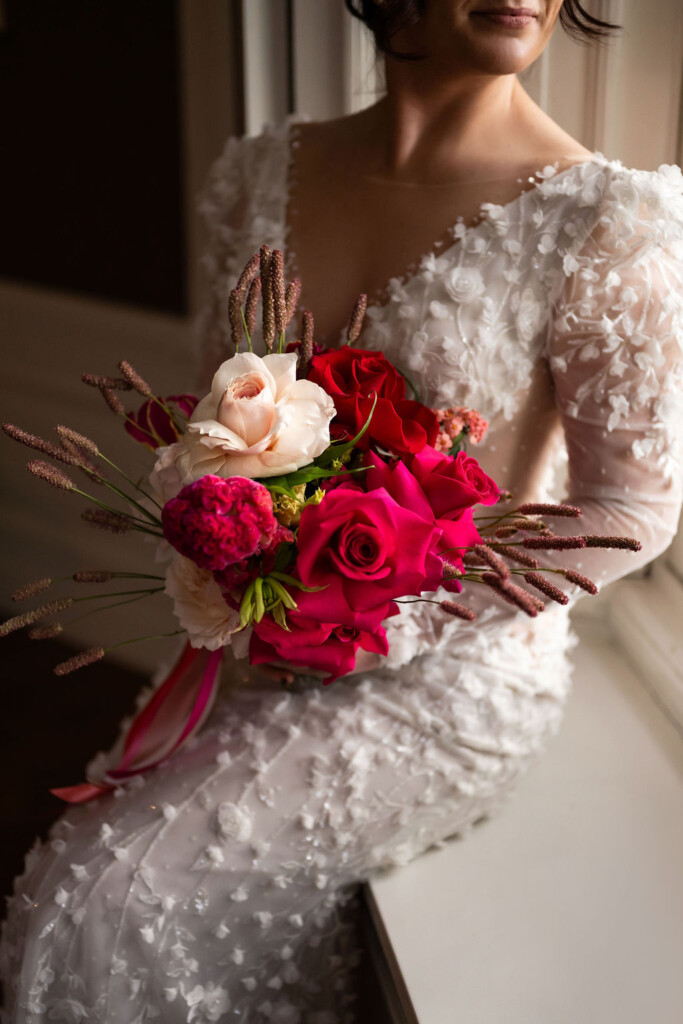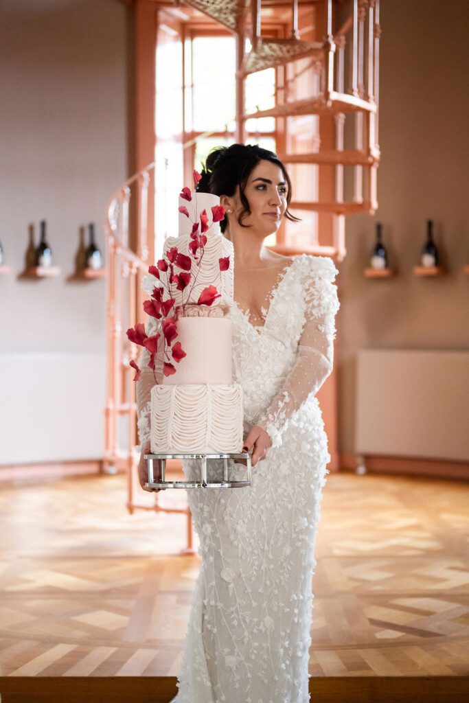 Een bruiloft hoeft niet wit en minimalistisch te zijn om romantisch te voelen. Dat bewijst deze Romantic Red styled shoot op Landgoed Salentein: knallend rood en roze, gecombineerd met weloverwogen bloemendetails, zorgen voor een sfeer die tegelijk uitbundig en intiem is. De absolute eye-catcher? De flowerwaterval op de eettafel.