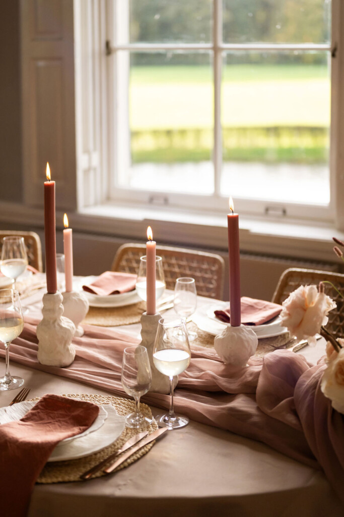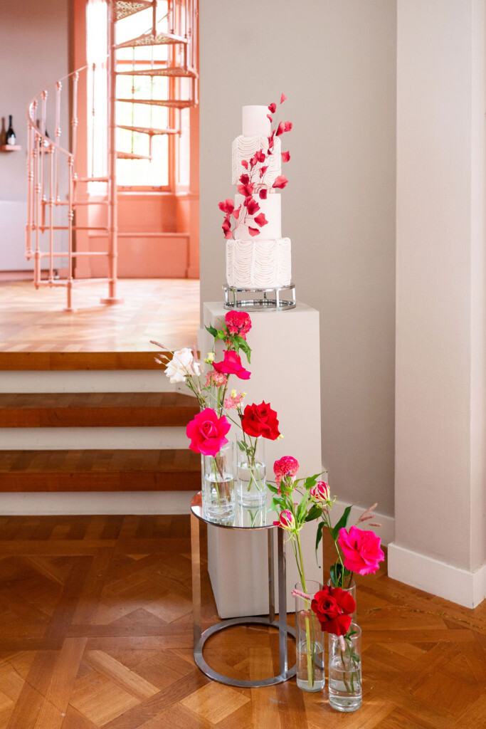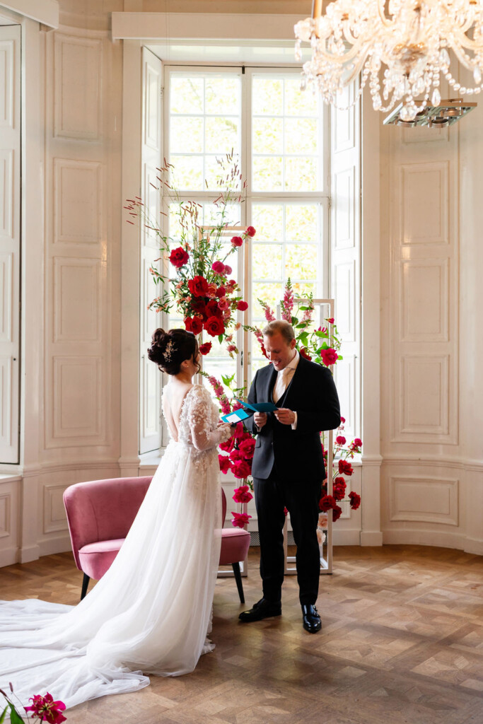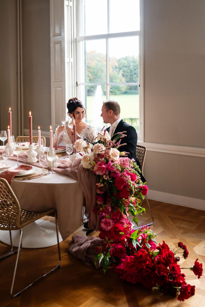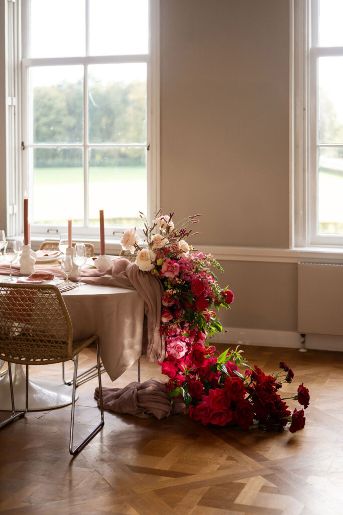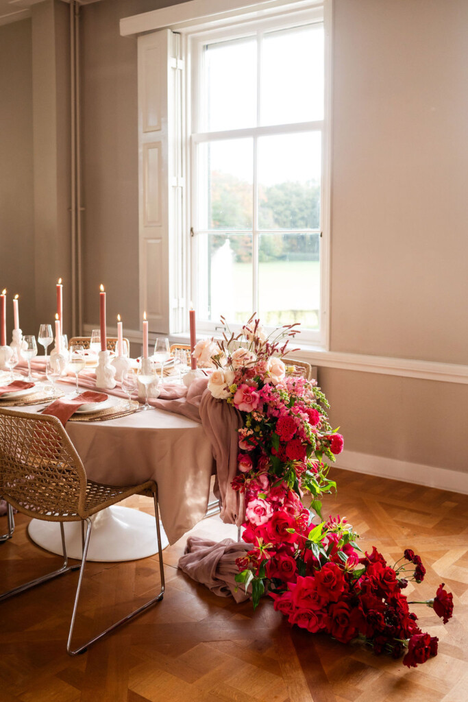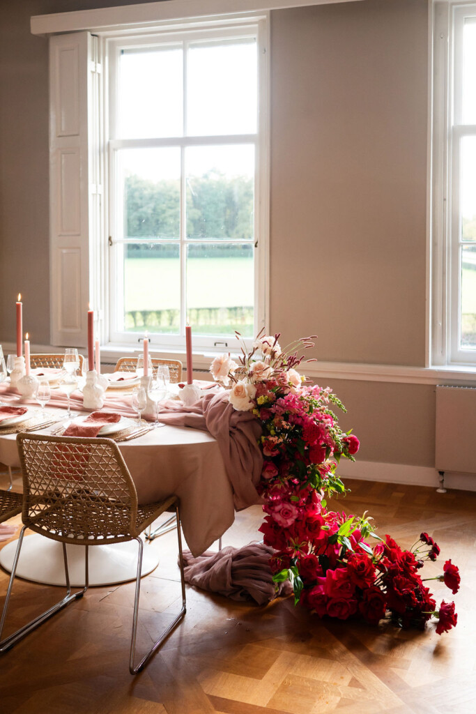 Dat je kleur kan toevoegen aan je bruiloft, maar toch een prachtige rustige sfeer kan neerzetten door de juiste styling en keuzes van bloemen. Een fijne romantische sfeer, maar wel met knallend rood en roze. En hoe mooi is de flowerwaterval op de eettafel? Een echte eye-catcher voor je bruiloft.