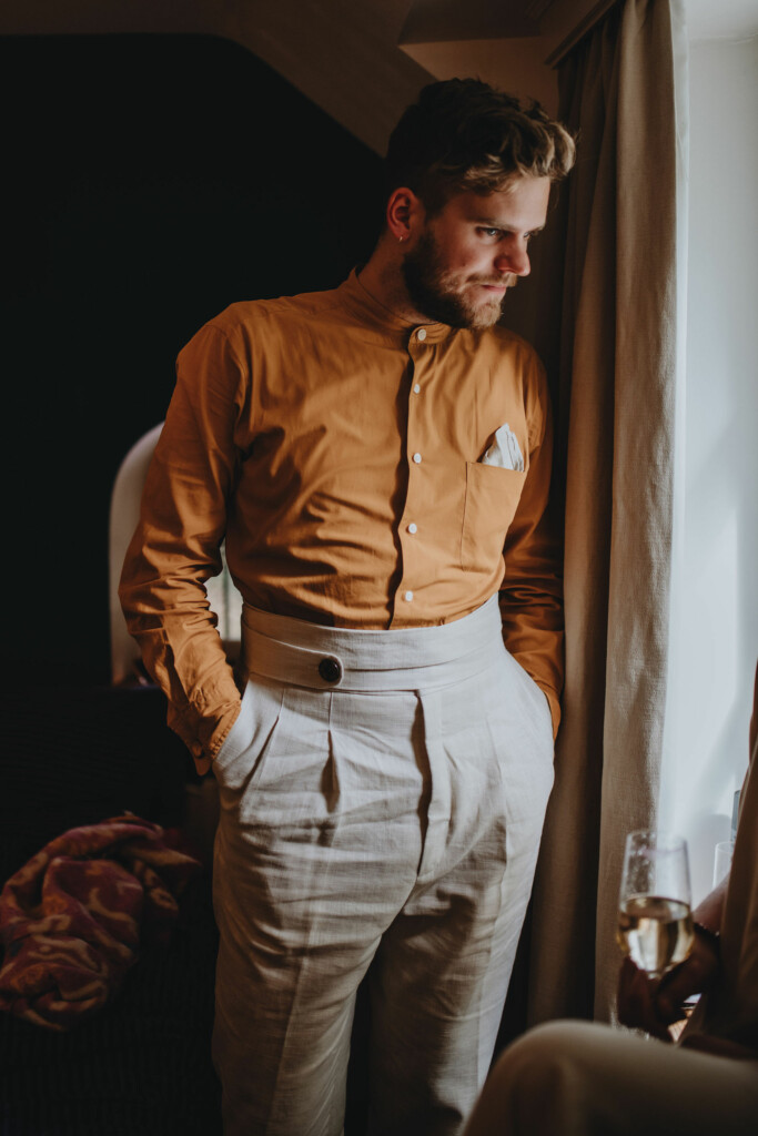 “Co heeft zijn pak laten maken bij Cafe Costume in Antwerpen, waar hij een weekendje was en spontaan naar binnen liep voor wat informatie. Hij heeft geprobeerd dichter bij huis een vergelijkbare winkel te vinden, maar het viel nog vies tegen om een fijne zaak te vinden waar ze deze kleur (terra/oranje) hadden. Uiteindelijk dus toch terug naar de zuiderburen en daar heeft hij geen moment spijt van gehad. Joanna, zijn getuige, wist wat Niels zou dragen en in welke kleuren, zodat ze ook qua kleding een match zouden zijn op de dag.”