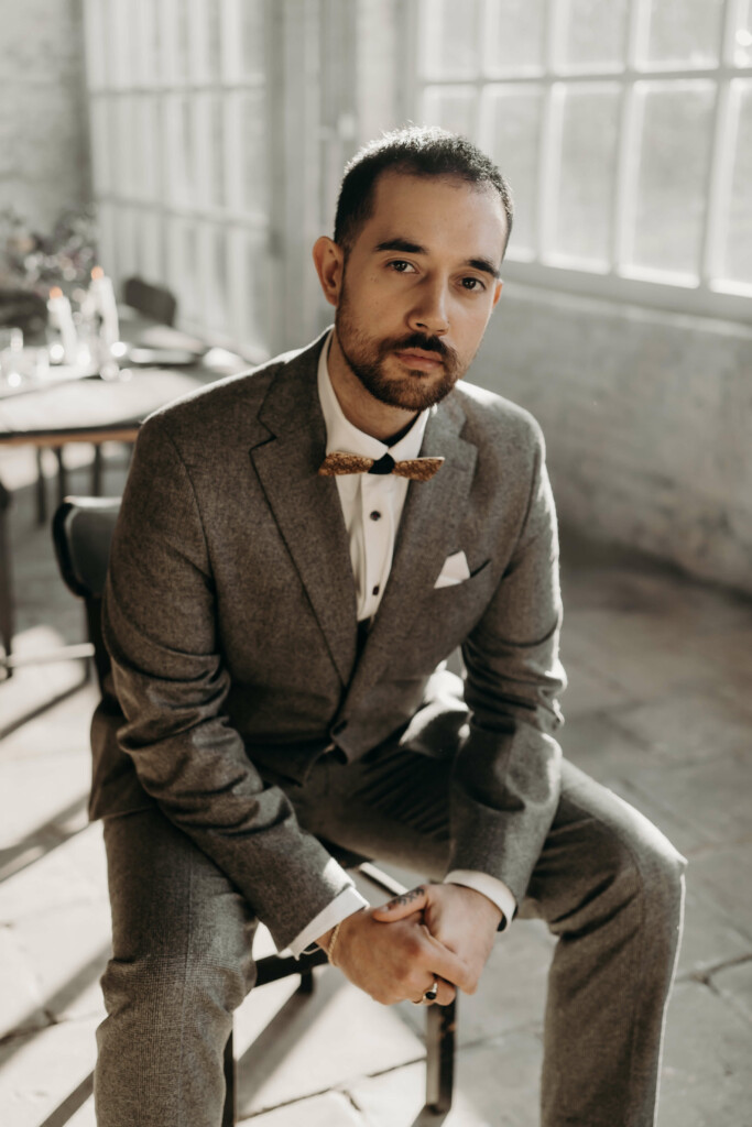 Ik ging daarvoor op zoek naar een industriële locatie en niet de klassieke ‘chique’ zaal. Zo kwam ik terecht bij Tombeek Plage & Ateliers, dat midden in de natuur is gelegen. De stijl van deze locatie is ideaal voor deze shoot evenals de aanwezige, hergebruikte materialen zoals vintage en antiek (stoelen, tafels, zetels, …).