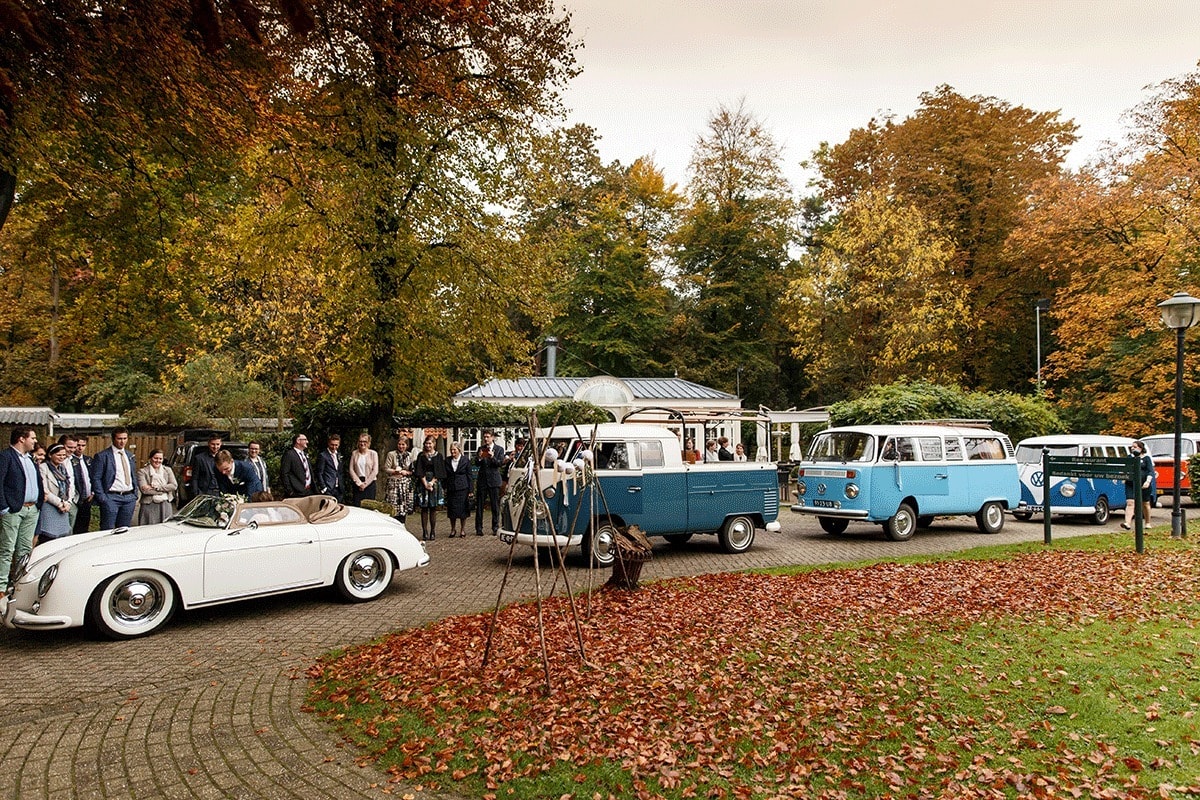 We zijn in Rhenen getrouwd, ik kom daar zelf vandaan en weet dus dat het daar in oktober echt prachtig is. Het is natuurlijk een hele bosrijke omgeving, en dan die kleuren in de herfst! Het was een echte bosbruiloft, we hebben het thema helemaal doorgetrokken. Gelukkig zat het weer ook mee en konden al onze plannen doorgaan. We zijn begonnen met het ontvangen van de gasten bij de locatie. Wij kwamen aanrijden, met achter ons 5 oude volkswagenbusjes. Hier wisten de gasten niets van en mochten ze als verrassing instappen om naar het gemeentehuis te rijden. Vanuit het gemeentehuis zijn we met alle busjes gestopt midden in het bos, waar onze ceremoniemeester (Feline Wedding & Events) alles klaar had staan voor een picknick. We hebben dus midden in het bos onze toost en taart gedaan, dat was echt geweldig! Het diner, de receptie, en de kerkdienst, het was allemaal onvergetelijk. Zo mooi om te zien dat alles op de trouwdag bij elkaar komt.