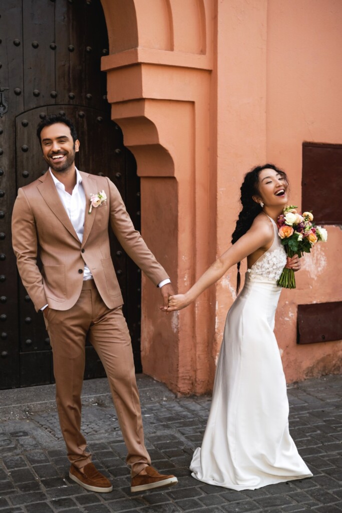 De warmte en de akoestiek van de riad zorgen voor een heerlijk intieme setting, waarin jullie nog lang kunnen natafelen met vrienden en familie. De echte liefhebber kan daarna nog het zwembad in, om de avond rustgevend af te sluiten. Bovendien creëer je met de juiste bloemenstyling een romantische sfeer, geheel in stijl met de aardse vibes van de riad. In de onderstaande shoot is dat heel mooi gedaan. Zo is er gekozen voor gele, oranje en roze tinten in de bloemenstyling van de tafel, trouwboog en bruidstaart. Kleuren die ook tijdens de trouw fotoshoot in de straten van Marrakech terugkwamen.