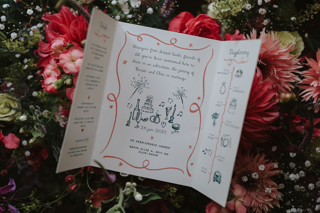 Renate en Chris waren nog nooit op een bruiloft geweest toen ze zelf gingen trouwen, en dat werkte in hun voordeel. Zonder vaste verwachtingen kozen ze precies wat bij hen paste: relaxed, lokaal geregeld en met iedereen de hele dag erbij. Op Landgoed Loenen in Slijk-Ewijk ontstond een dag die zelfs eindigde met een spontaan dansje dat eigenlijk al geschrapt was.