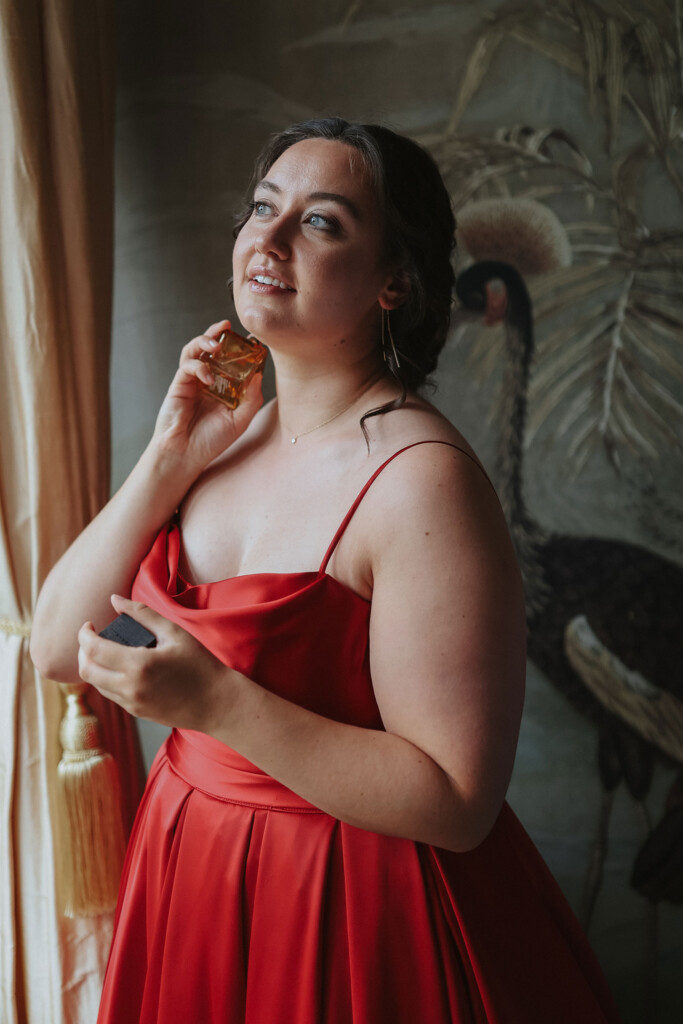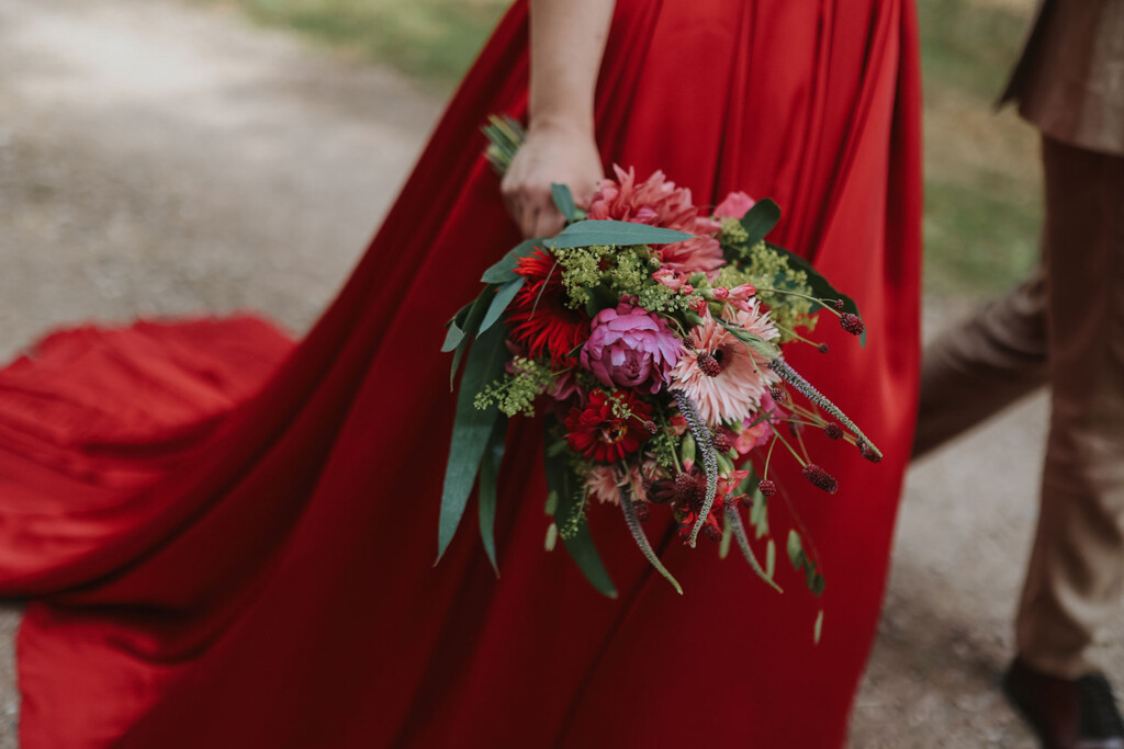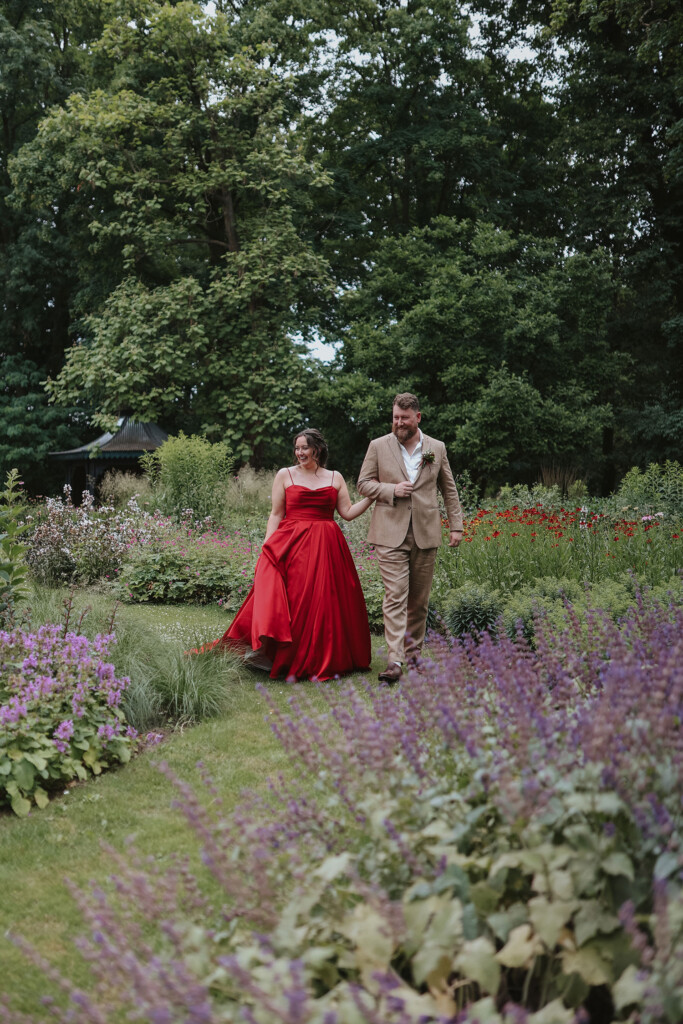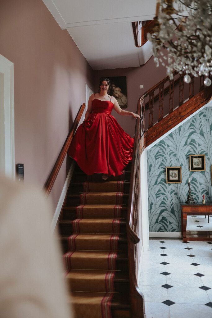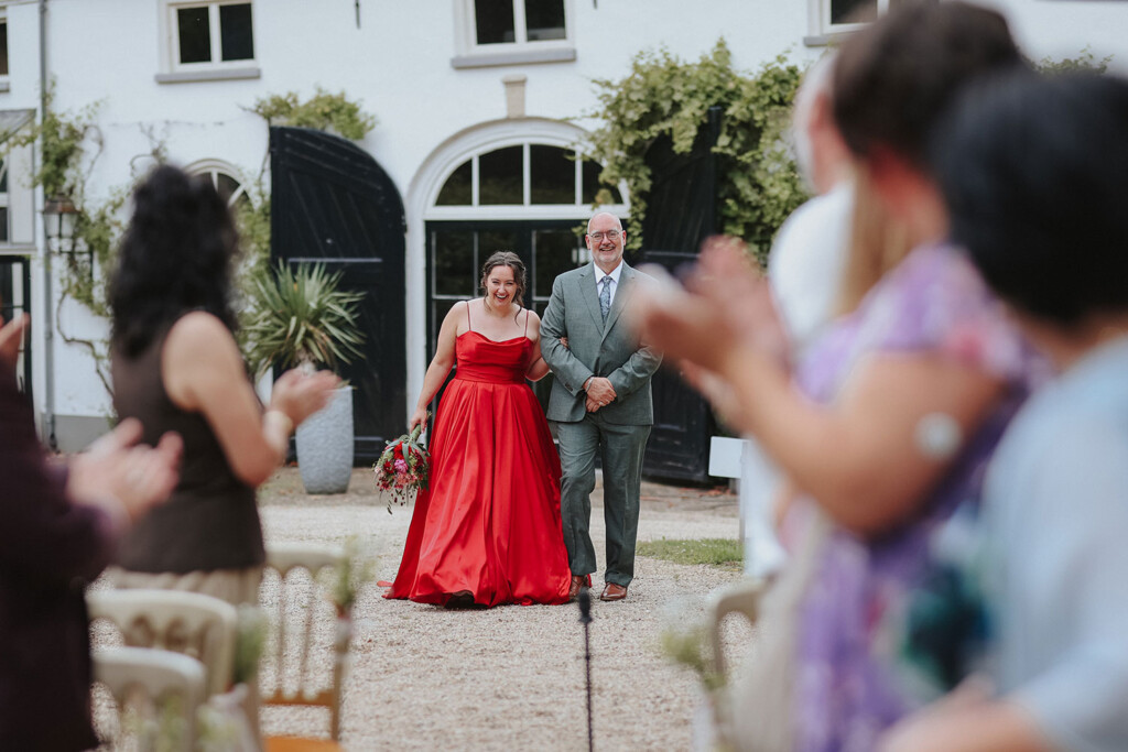 Renate: Mijn jurk heb ik gekocht bij d’Amore in Arnhem. Ik had een aantal witte jurken gepast, maar ik voelde me er niet goed in. Ik draag in het dagelijks leven ook nooit wit, dus ik was al een beetje zenuwachtig voor het uitzoeken van de jurk. Er hing één rode jurk in de winkel, en toen ik die paste was ik meteen verkocht. Hij is van Maggie Sottero (Scarlet).