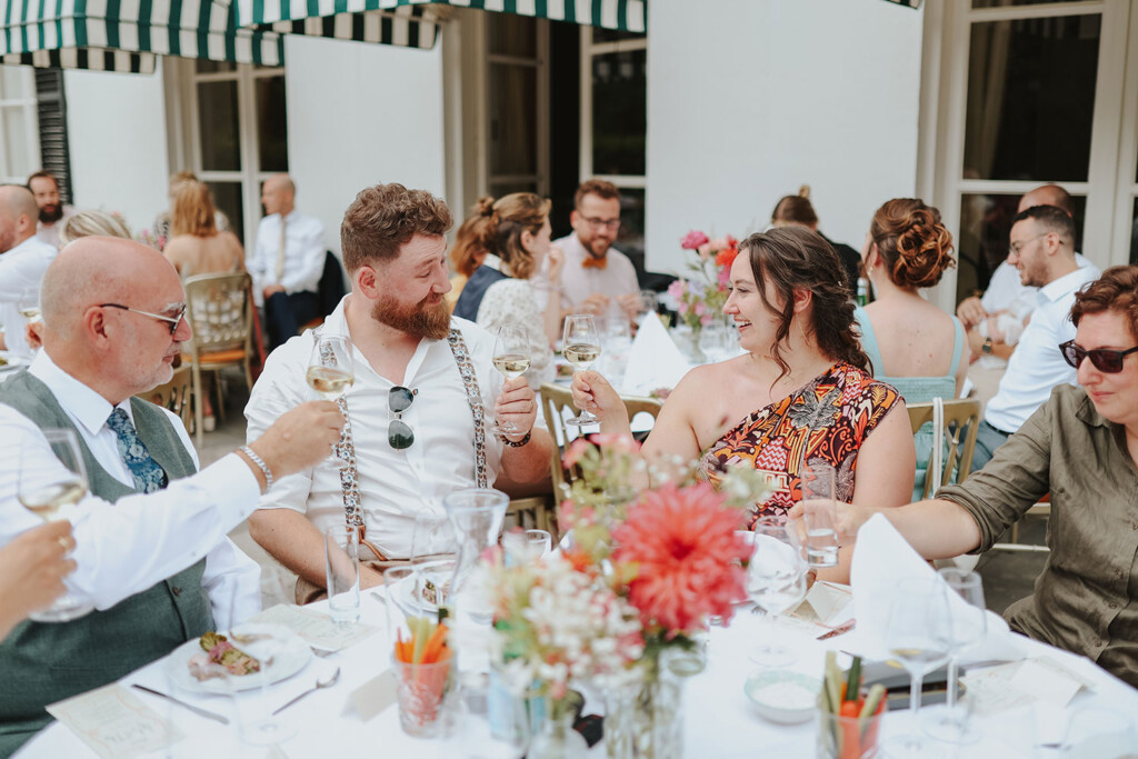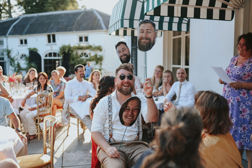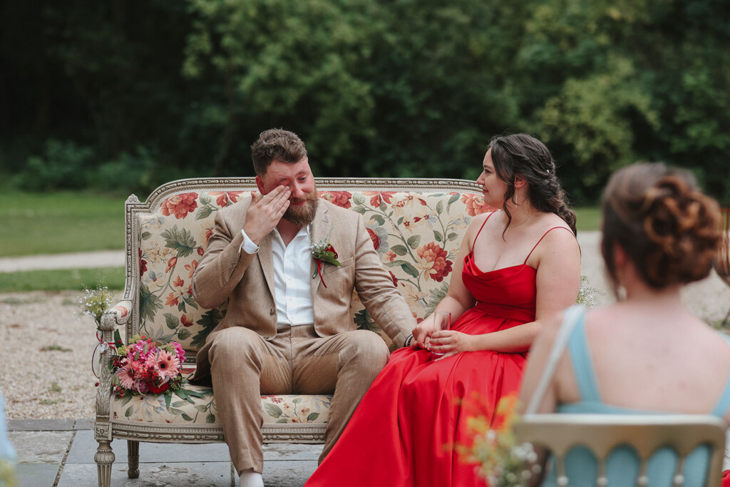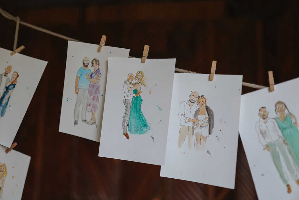 Renate: Het moment tussen de ceremonie en het diner in. We hadden ongeveer twee uur de tijd waarin gasten verschillende dingen konden doen: meedoen met een chachacha dansworkshop, een korte rondleiding over het landgoed, een portretje laten schilderen bij een live tekenaar, of gewoon even lekker een plekje op het landgoed zoeken om te chillen. Het was zo leuk voor ons om tijdens die paar uurtjes rond te lopen en iedereen lekker zijn ding te zien doen.