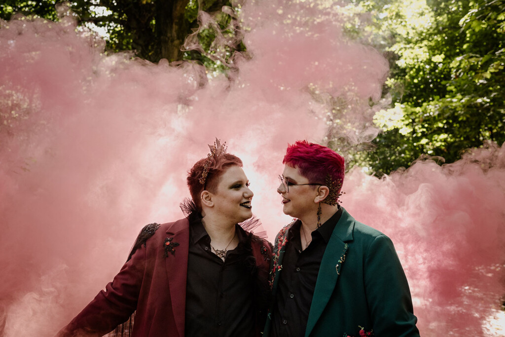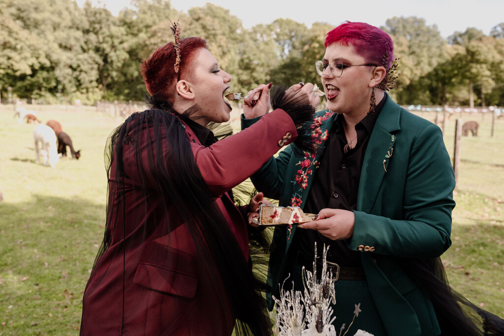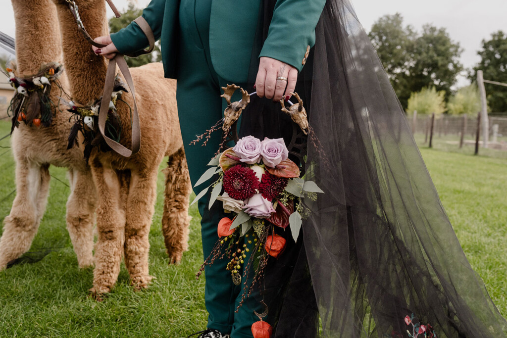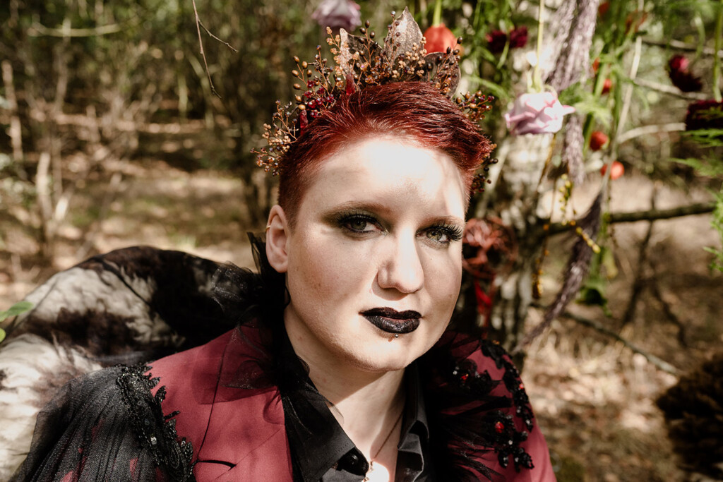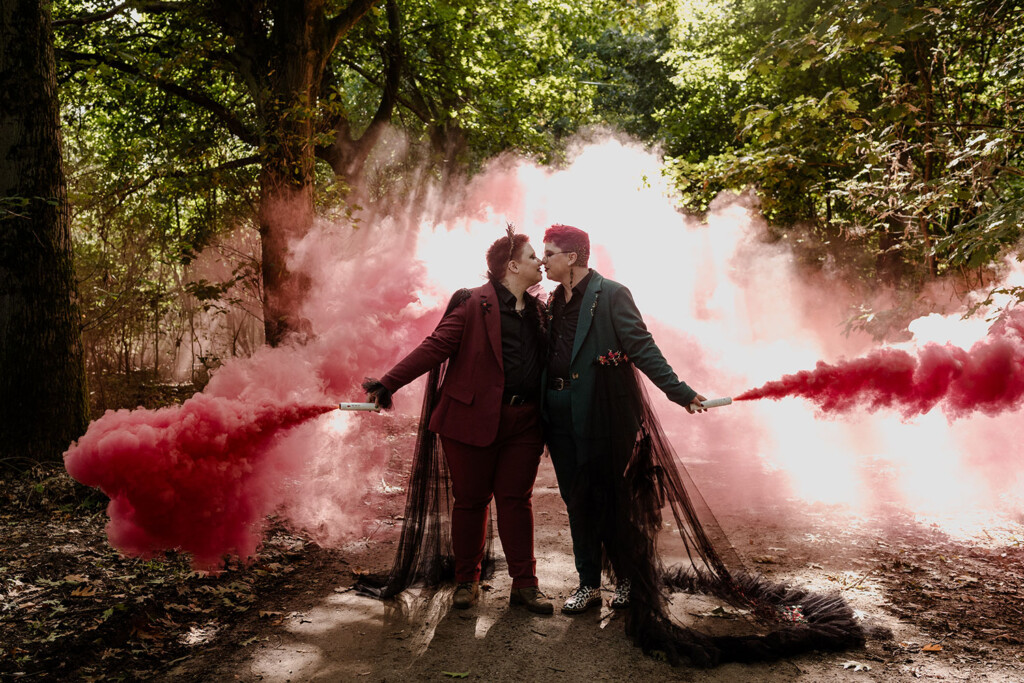 Het queer koppel in deze shoot is al vanaf het eerste uur fan van Lobsters. Enkele maanden eerder vierden zij hun eigen bruiloft, maar juist daarom voelde deze dag extra bijzonder: een tweede moment om hun liefde te vieren, dit keer los van verwachtingen, puur en vrij. Woodland Witch laat zien dat een bruiloft (of een liefdesviering) niet hoeft te voldoen aan trends of perfectie om krachtig te zijn; juist door rauwheid, symboliek en bewuste keuzes ontstaat iets dat écht klopt.