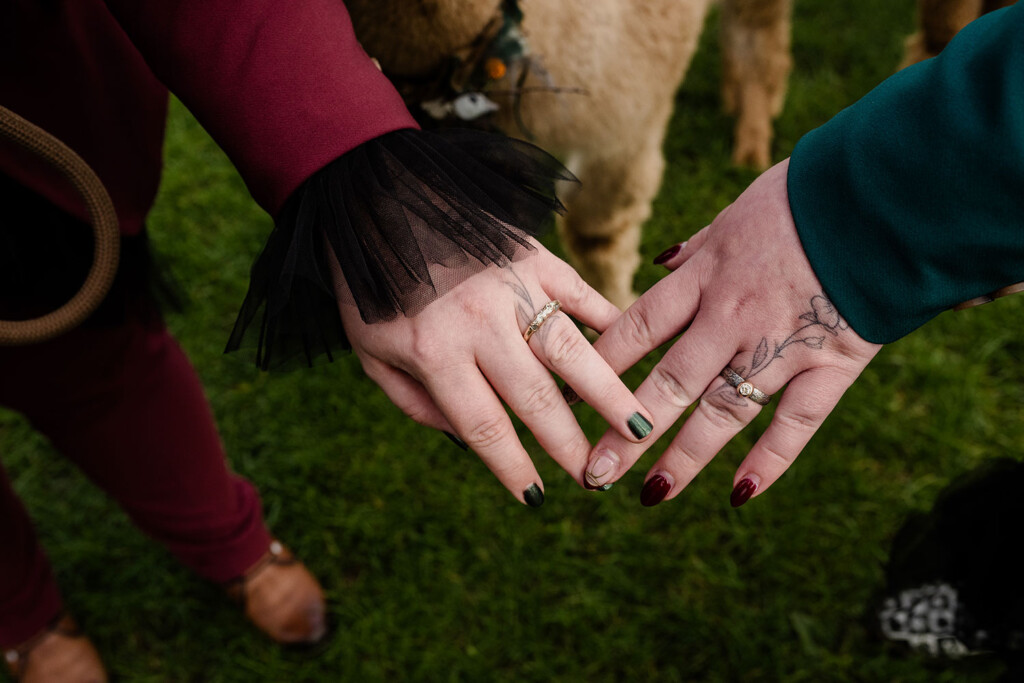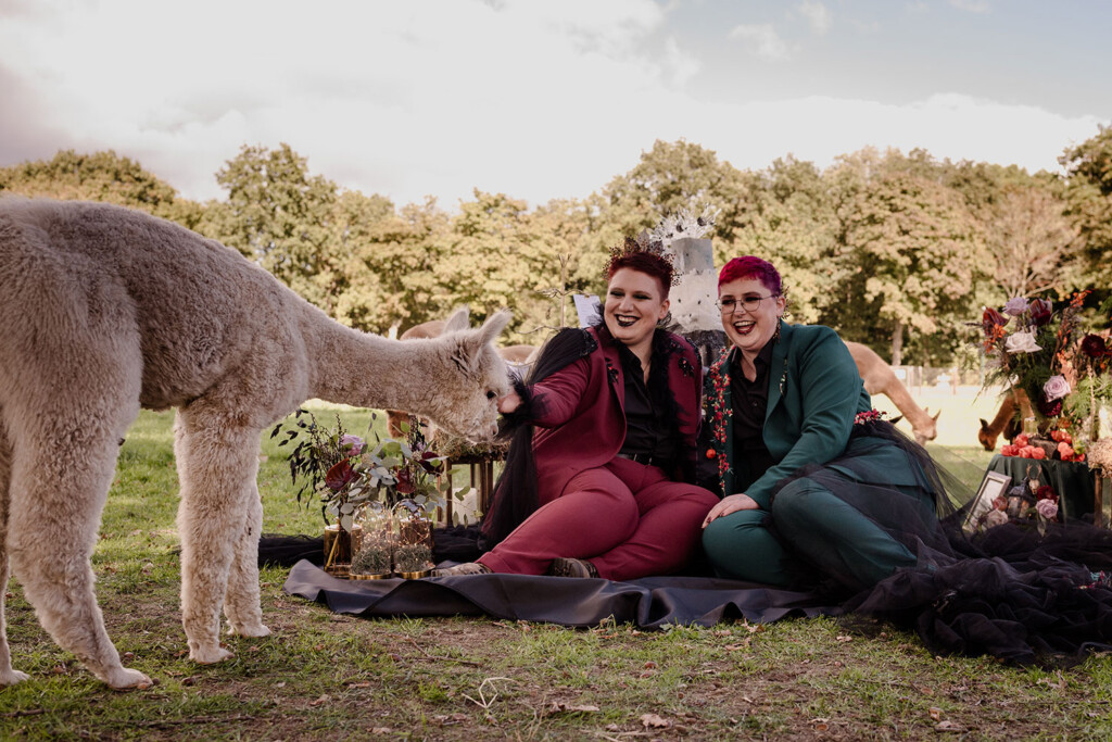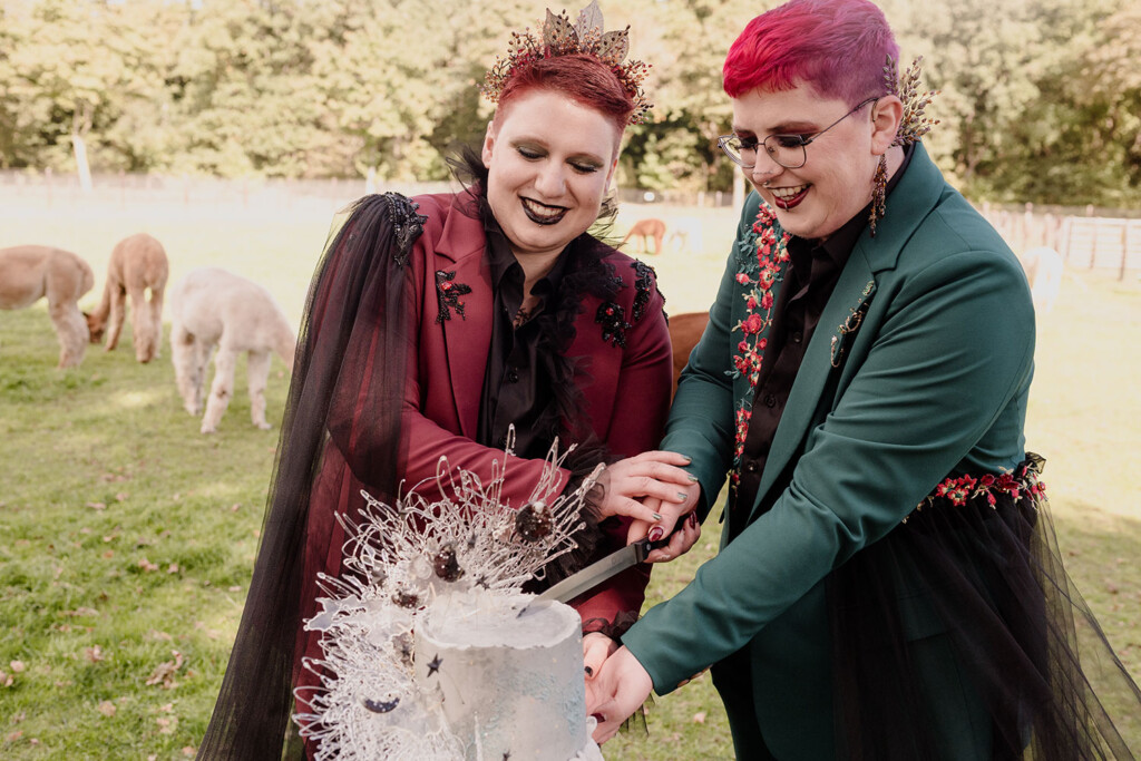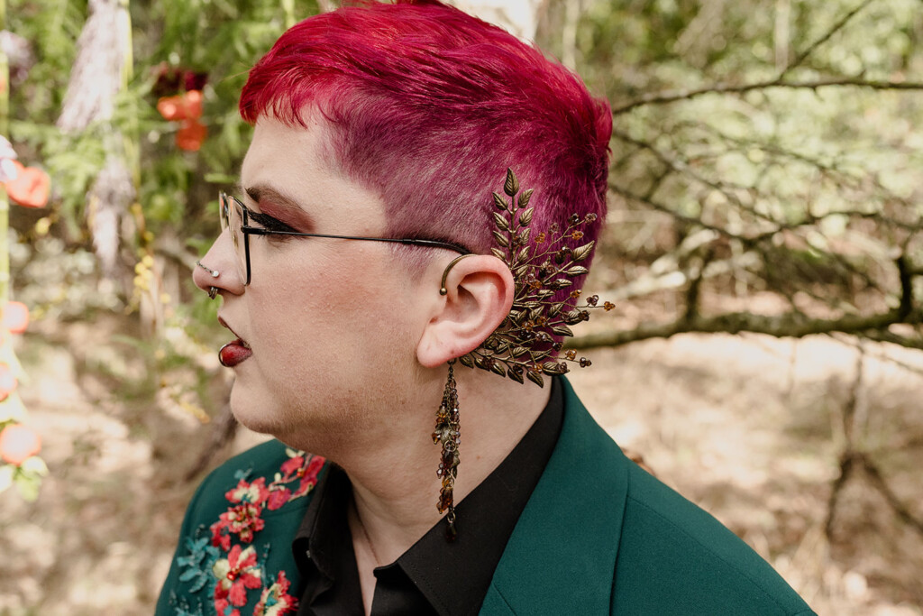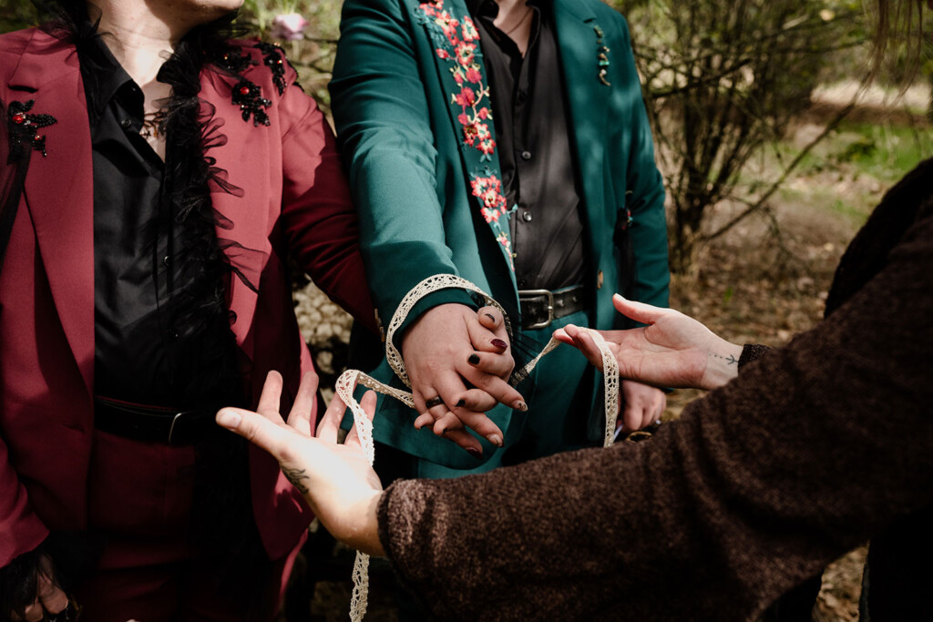 Het queer koppel in deze shoot is al vanaf het eerste uur fan van Lobsters. Enkele maanden eerder vierden zij hun eigen bruiloft, maar juist daarom voelde deze dag extra bijzonder: een tweede moment om hun liefde te vieren, dit keer los van verwachtingen, puur en vrij. Woodland Witch laat zien dat een bruiloft (of een liefdesviering) niet hoeft te voldoen aan trends of perfectie om krachtig te zijn; juist door rauwheid, symboliek en bewuste keuzes ontstaat iets dat écht klopt.