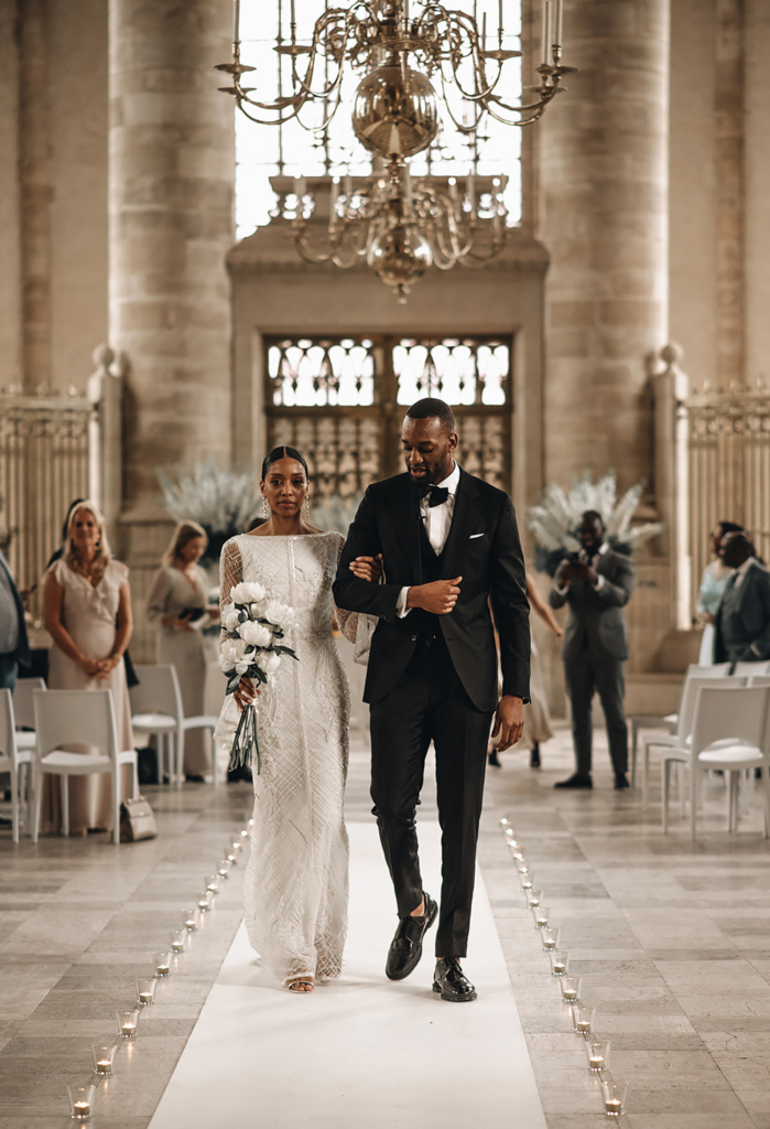 “Onze versiering was minimalistisch. De grote bloemen komen van Atelier Krijn Verboom in Rotterdam. De sokkels waar de bloemen op stonden, hebben we zelf gemaakt. Verder hebben we de kerk aangekleed met waxinelichtjes en een loper.”